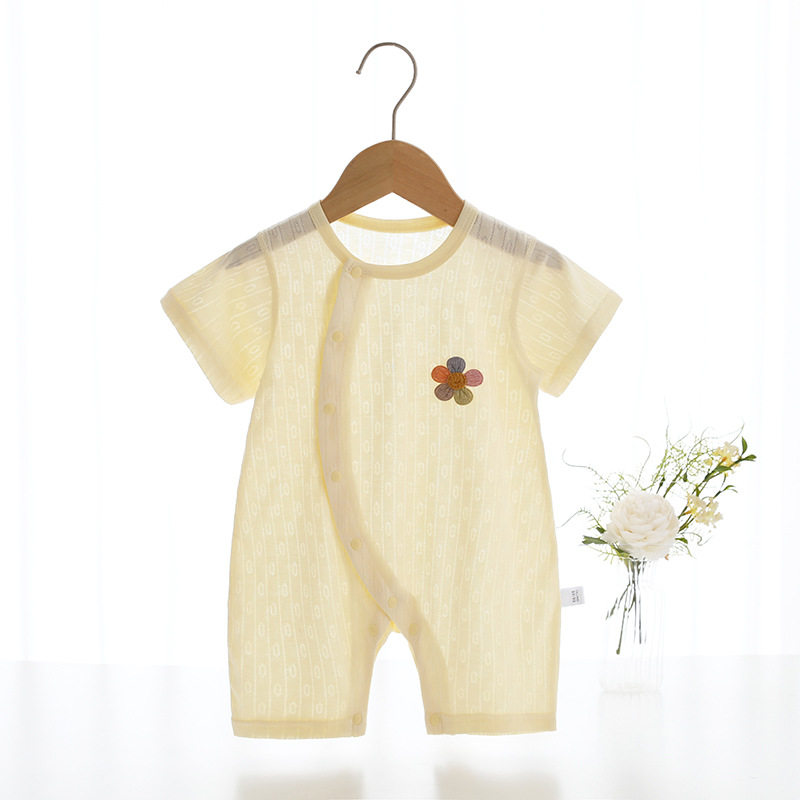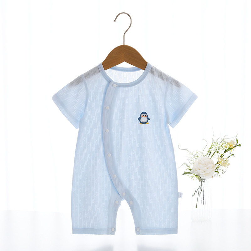 婧麒新生儿婴儿衣服春夏季薄款长袖哈衣宝宝偏扣竹纤维短袖连体衣
