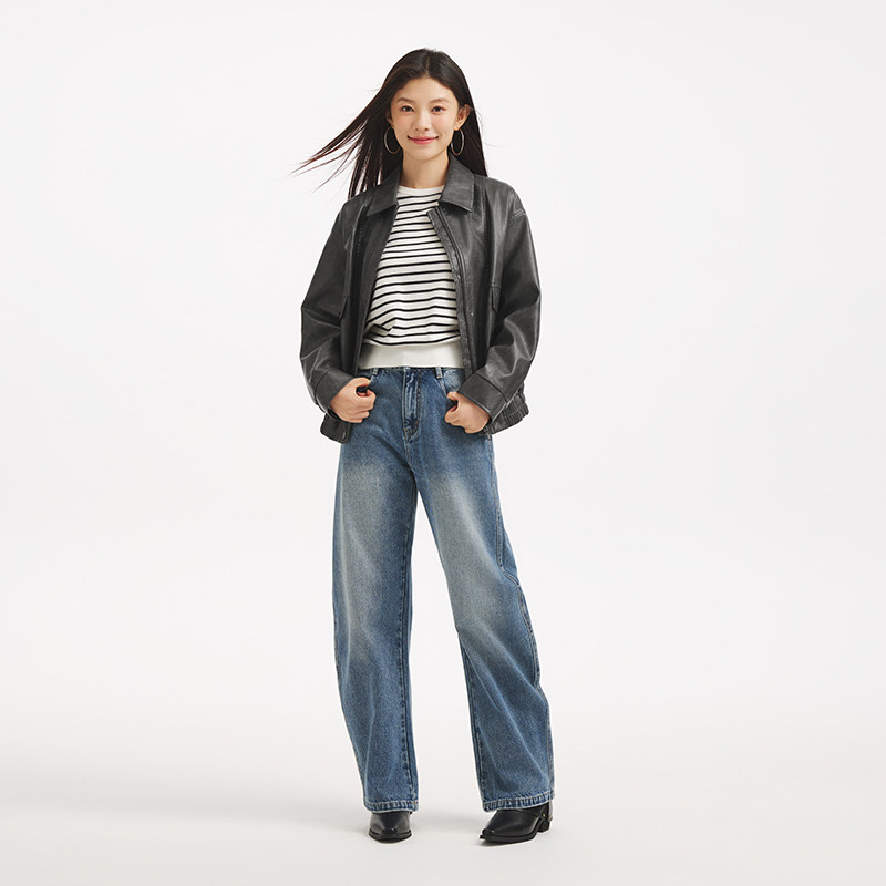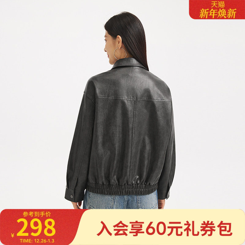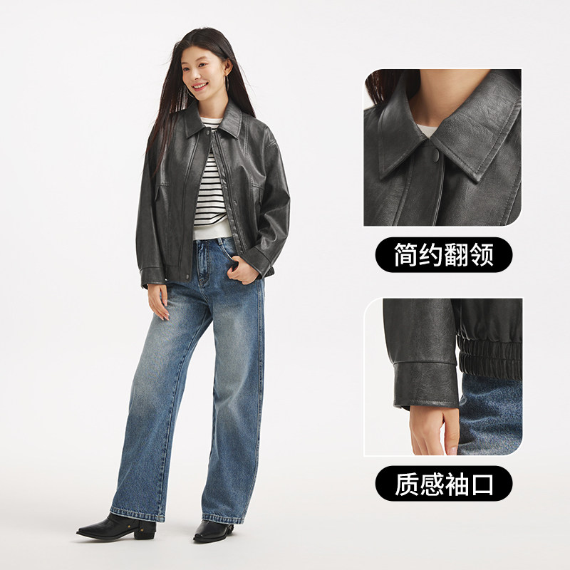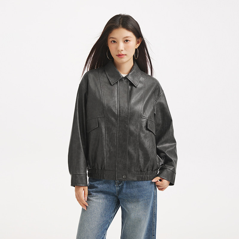 热风女士pu夹克外套2025年秋季新款双色仿皮夹克机车风复古外套
