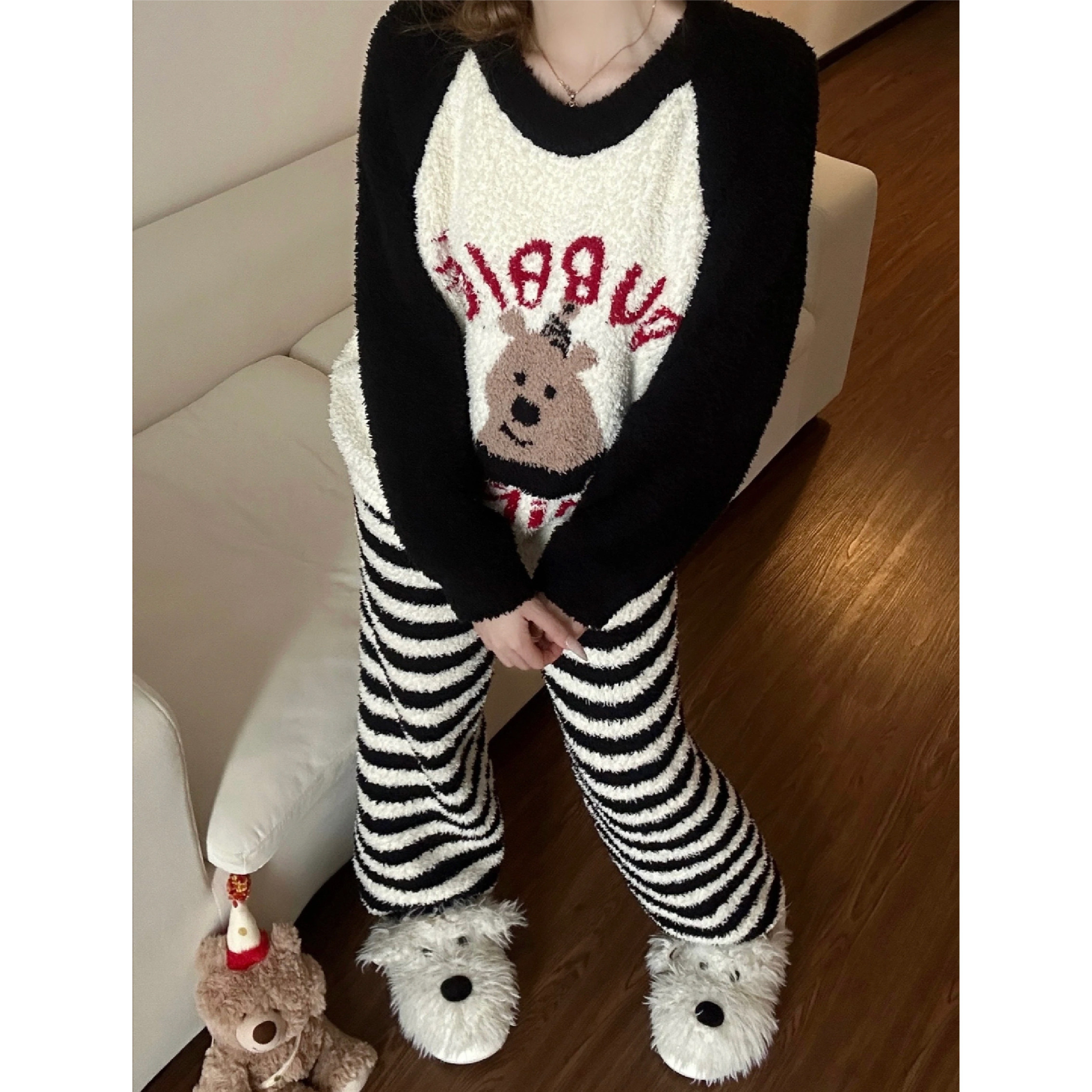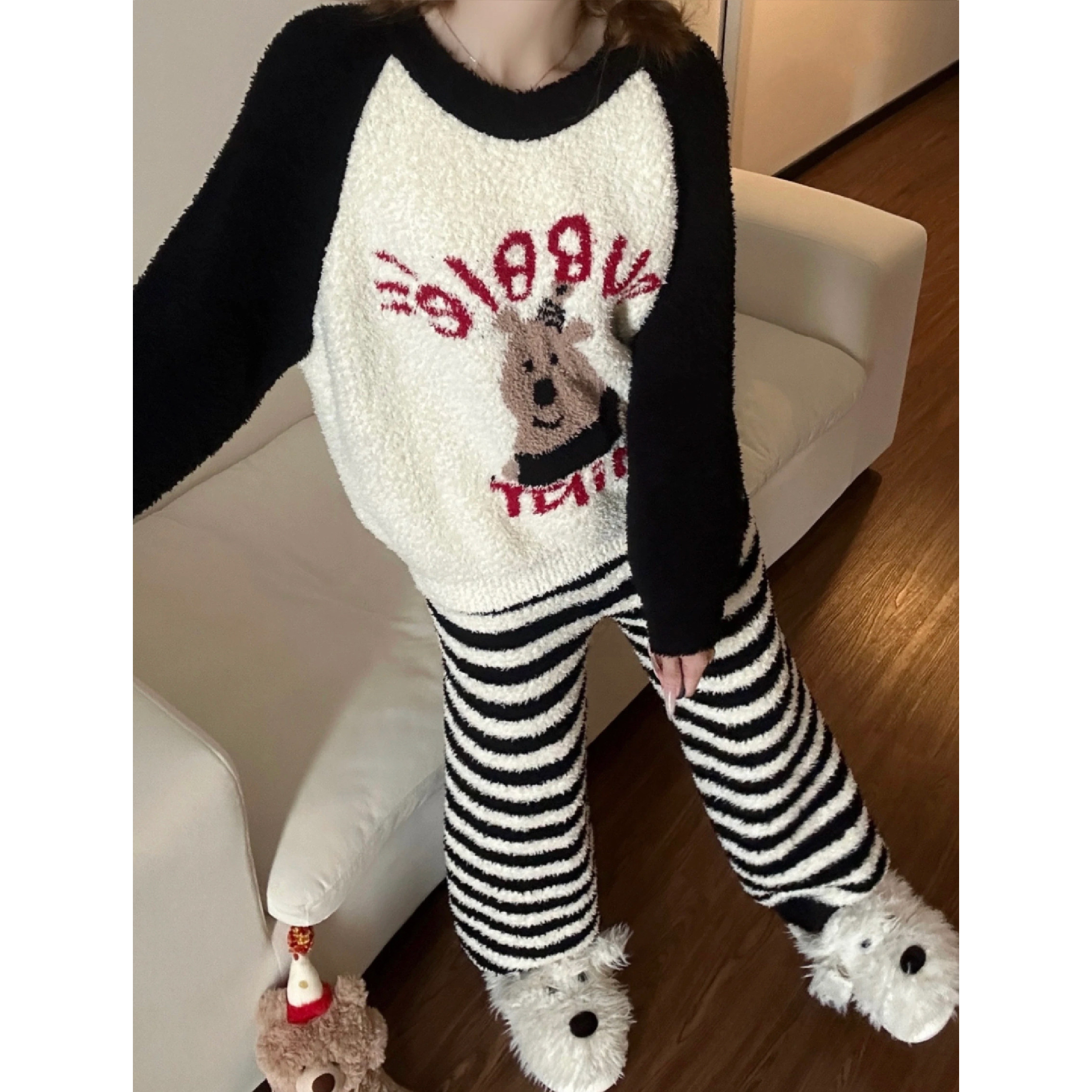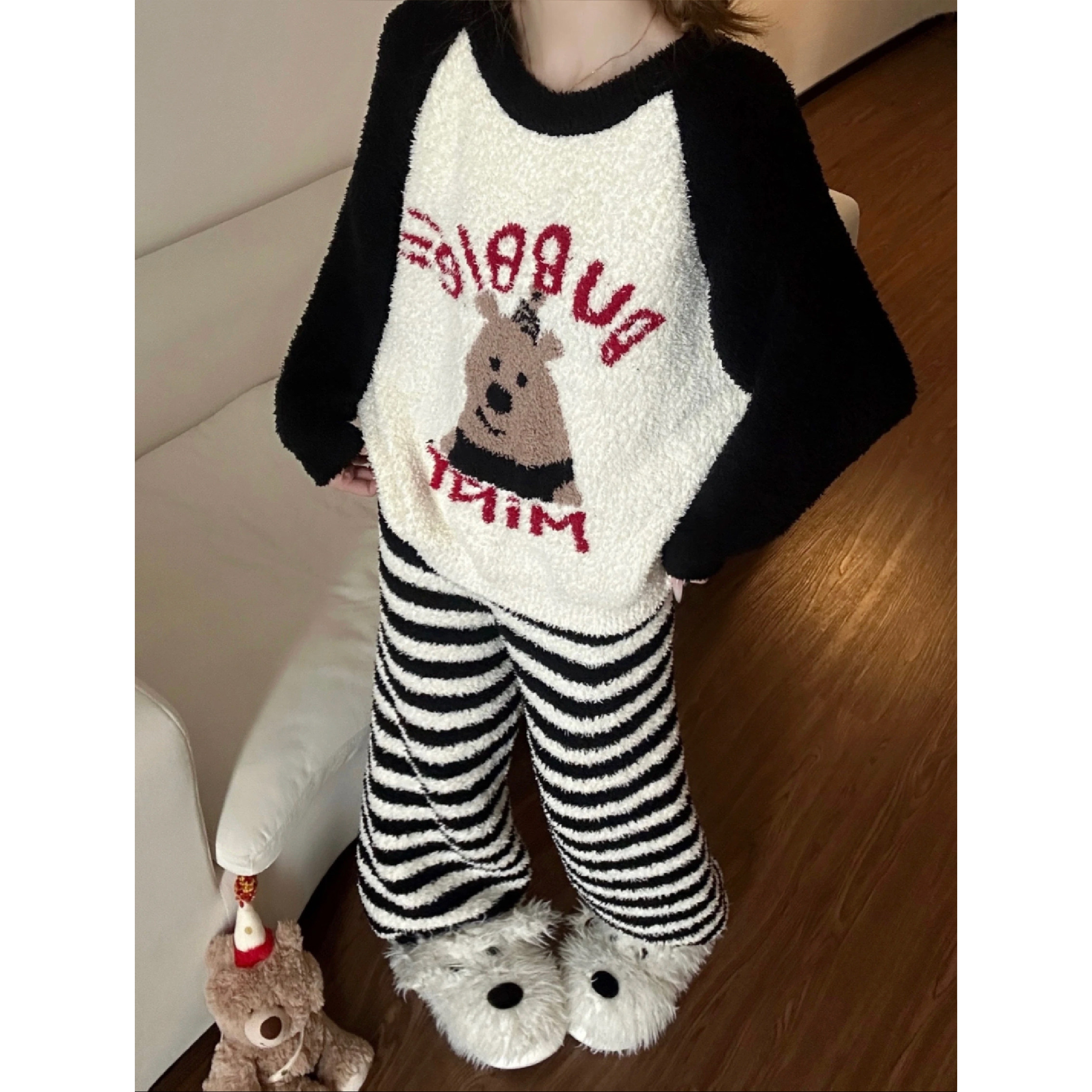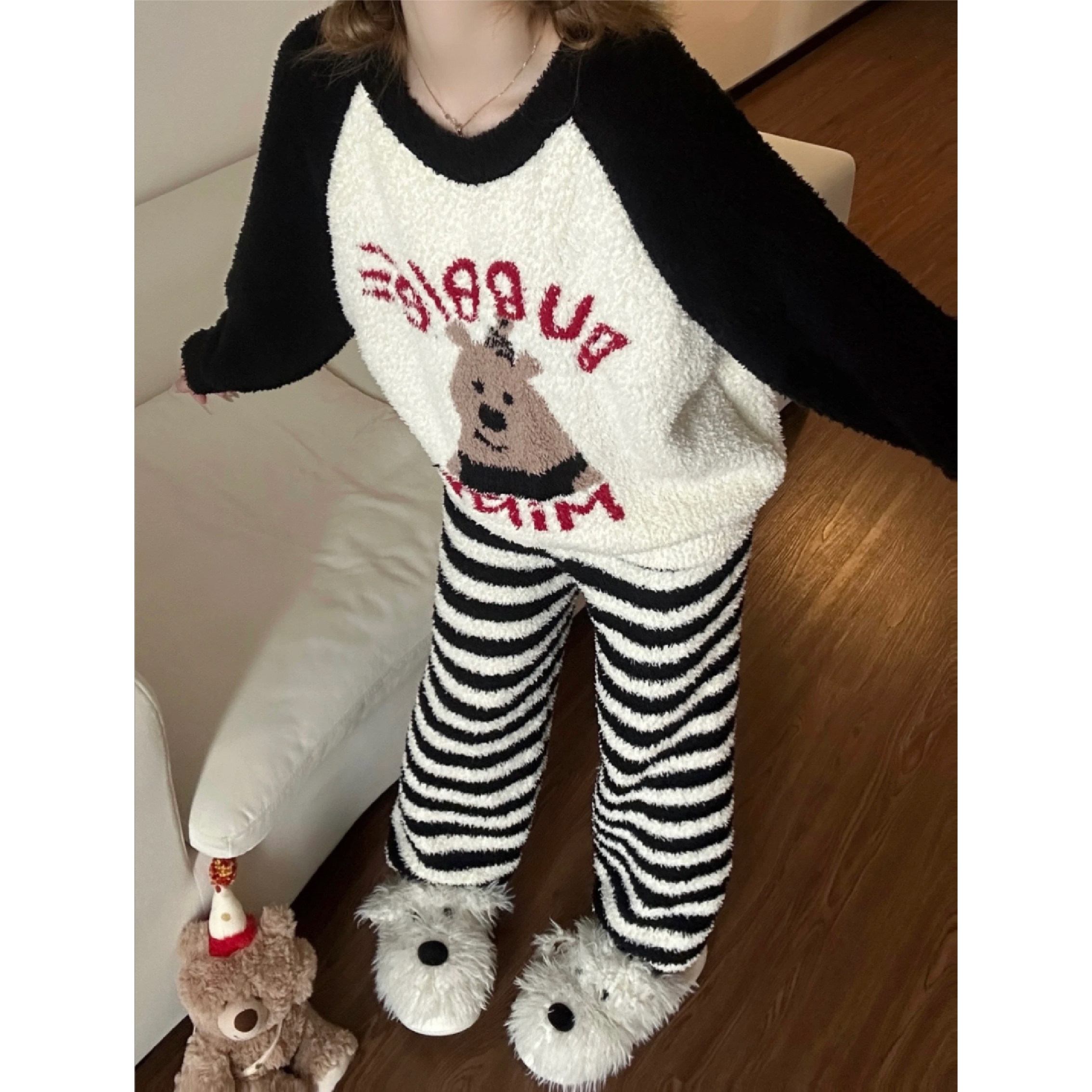 秋冬季条纹卡通睡衣女日系2025新款网红加绒加厚半边绒家居服套装