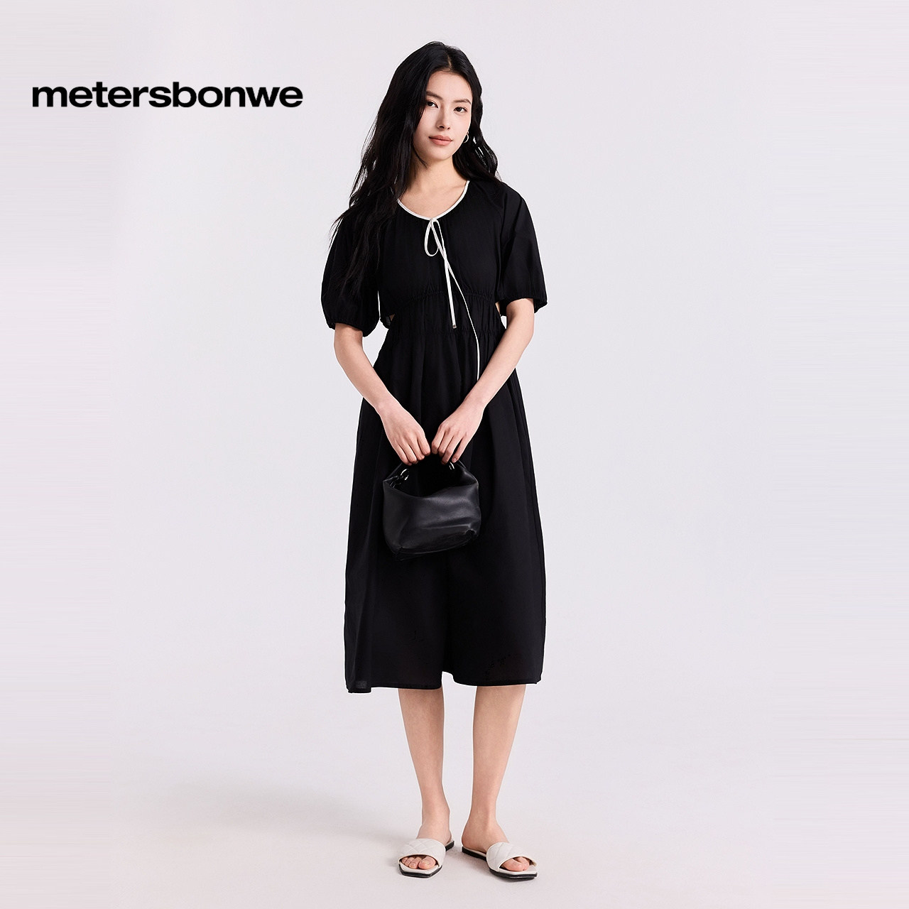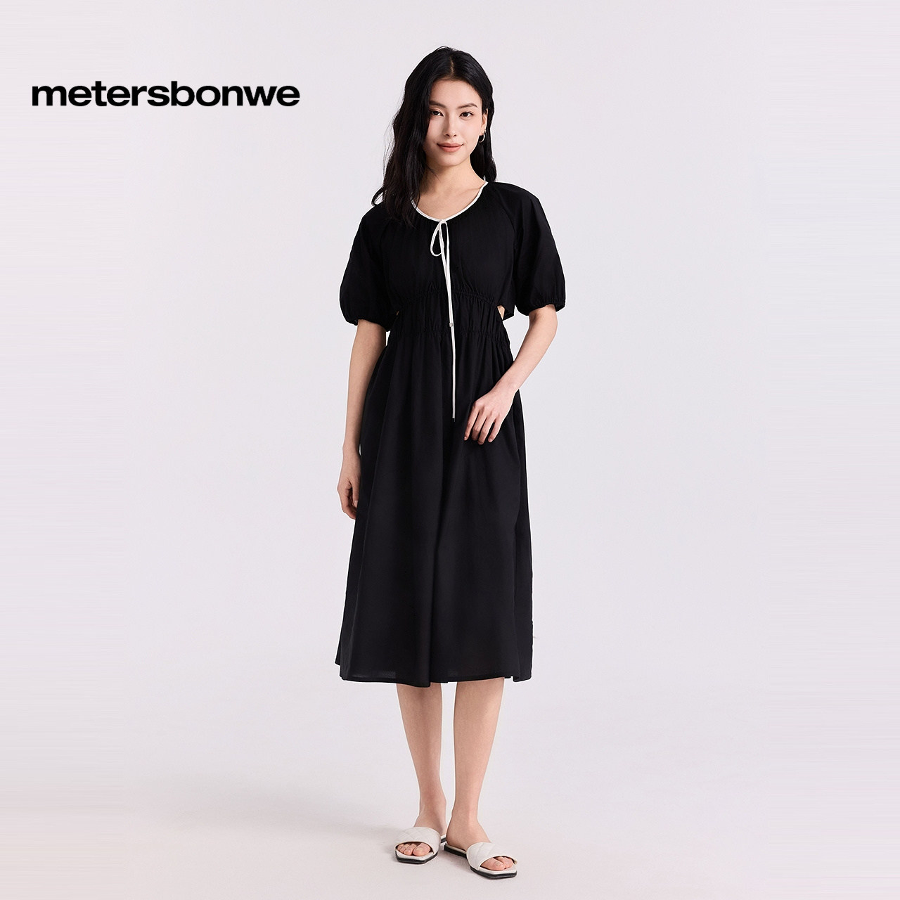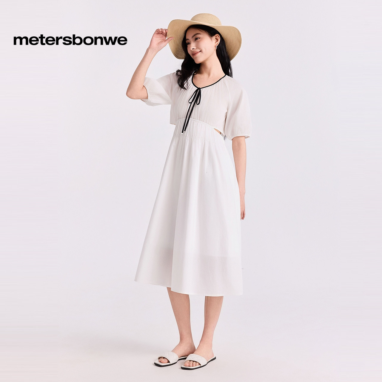 美特斯邦威连衣裙女夏季甜美休闲风撞色飘带泡泡袖连衣裙中长裙