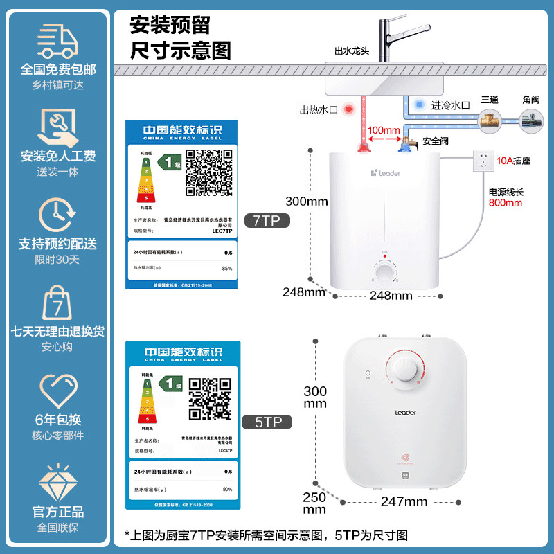 海尔出品统帅小厨宝家用厨房电热水器小型台下7升速热储水式7TP