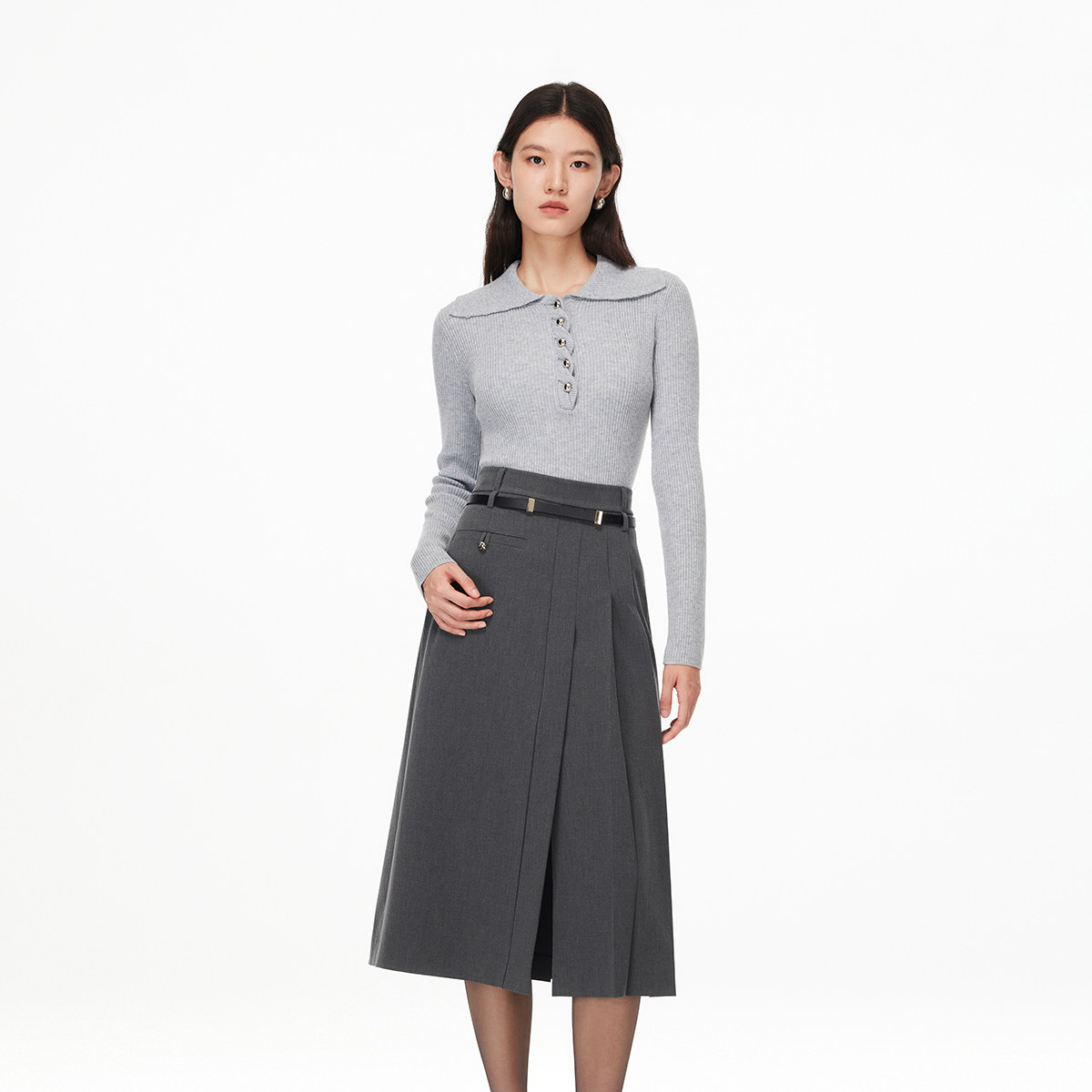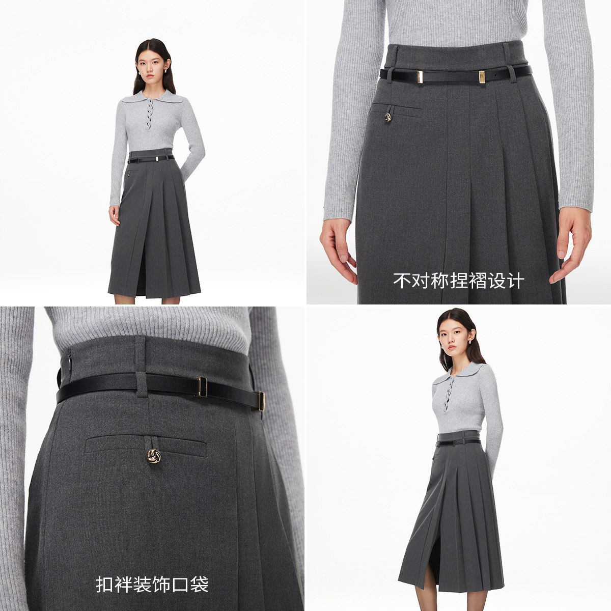 A摆半身裙,视觉显高显瘦,不对称捏褶设计