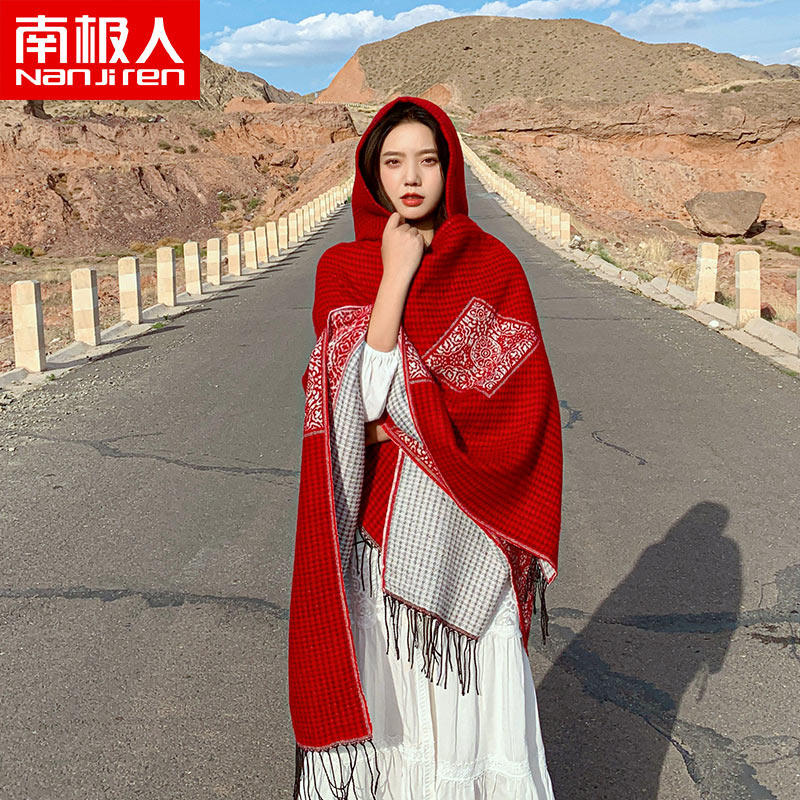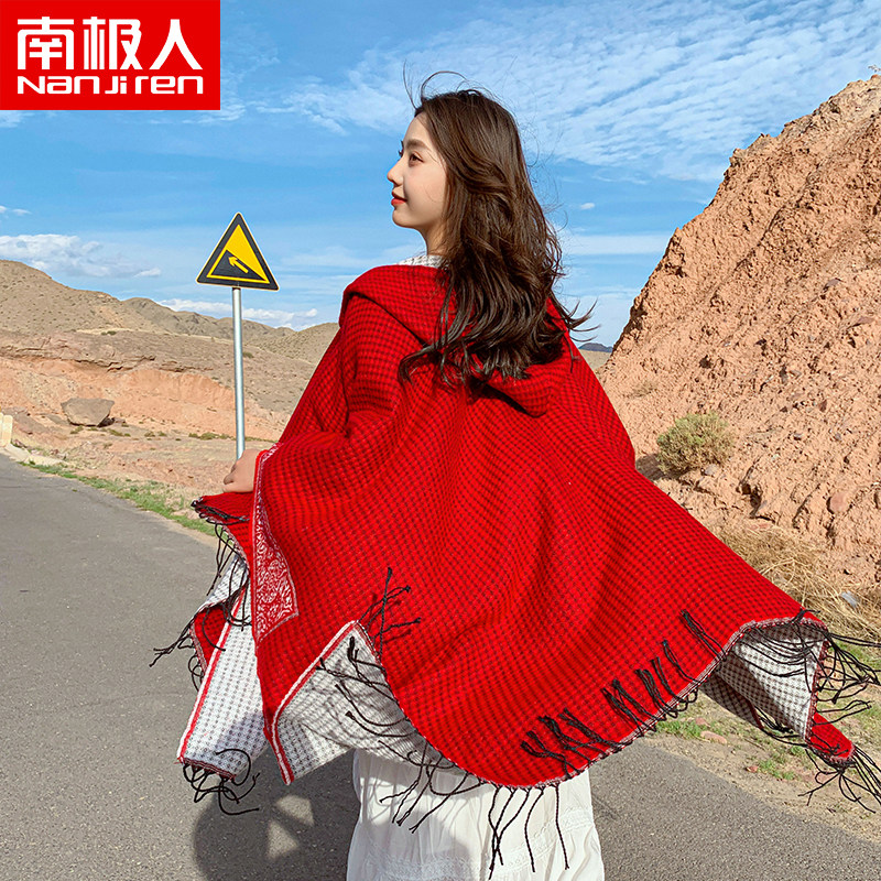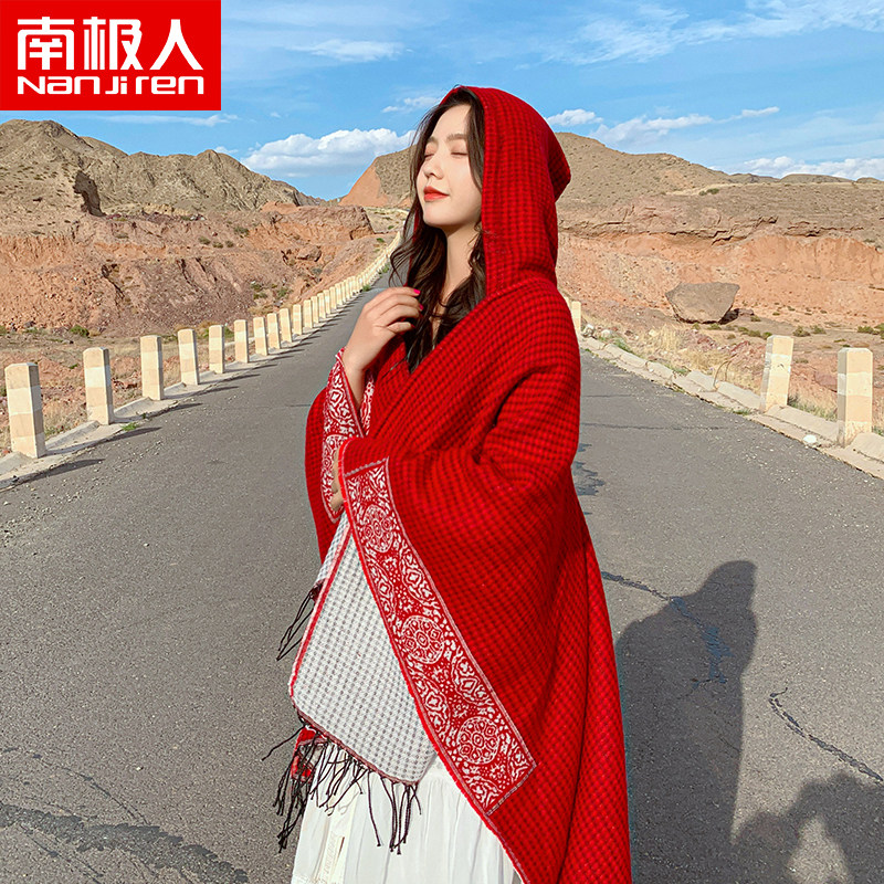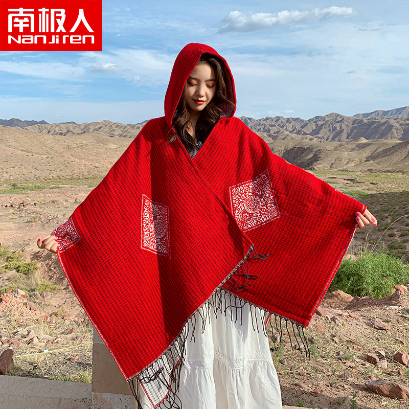 南极人春夏防晒披肩女红色民族风斗篷外出旅行百搭时尚空调毯子H