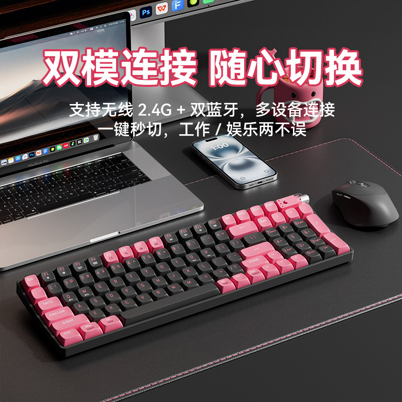 梦族小翘无线蓝牙机械键盘鼠标套装少女系高颜值女生可爱办公黑粉