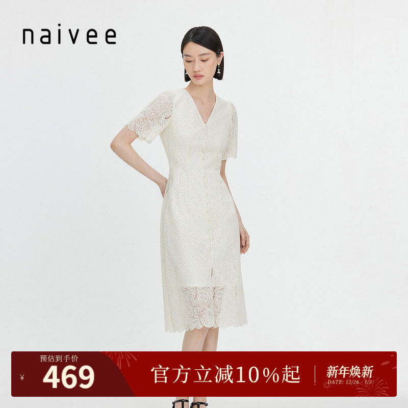 纳薇夏款法式刺绣蕾丝连衣裙收腰显瘦轻礼服裙V领泡泡袖裙子