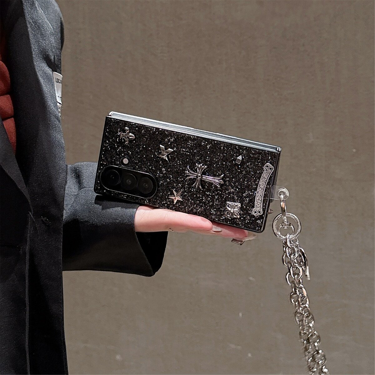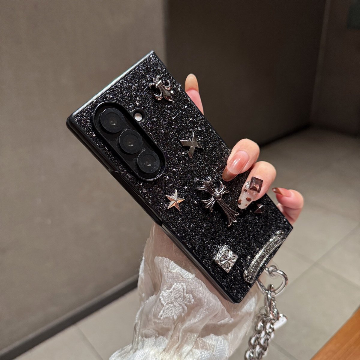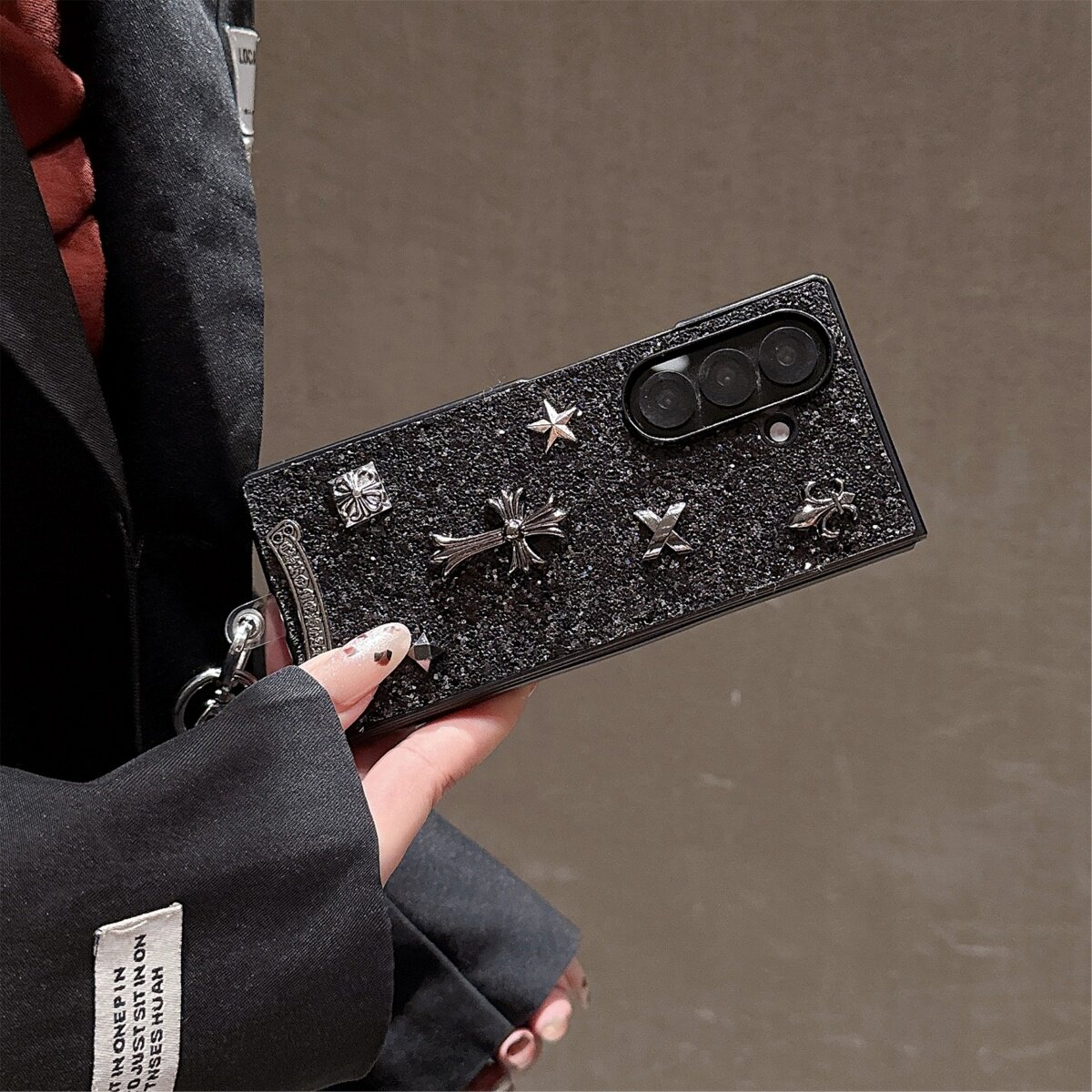 亮片黑色立体潮牌铆钉十字架花心适用三星galaxyzfold7/6/5手机壳折叠屏w24/w23保护套全包ZFlip7/5/4个性ins