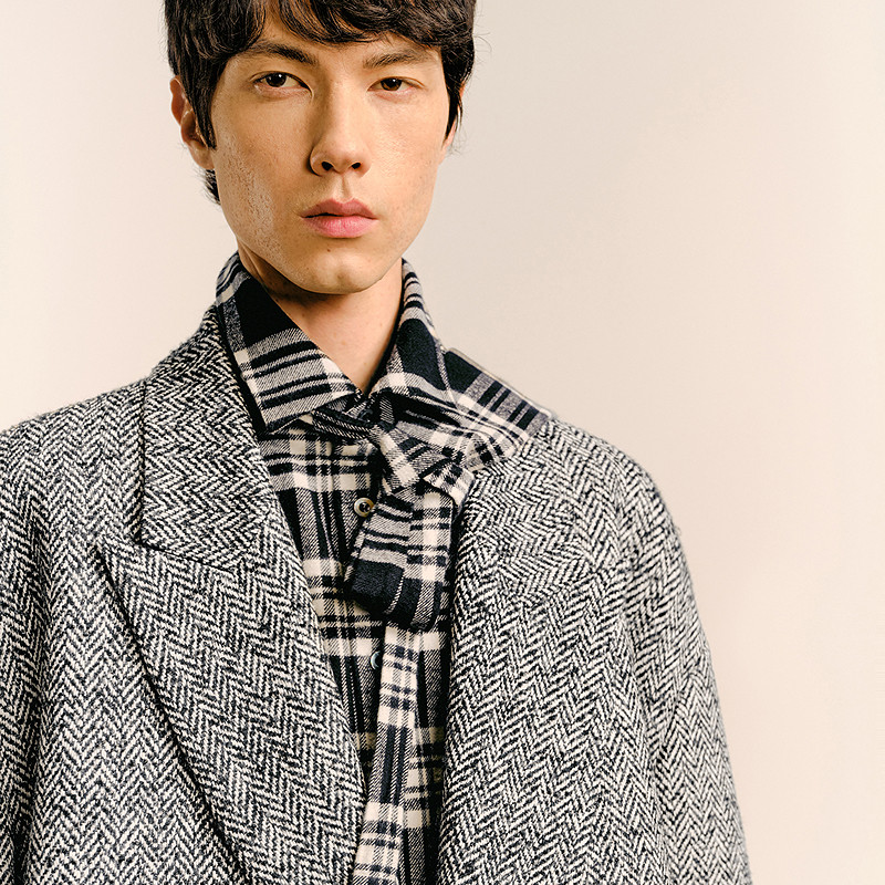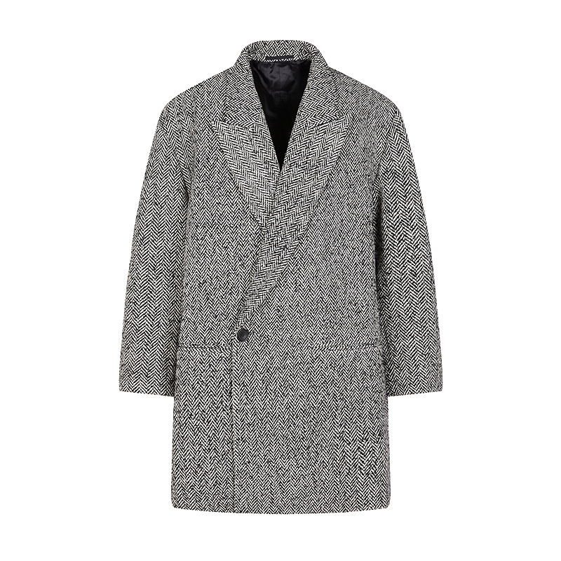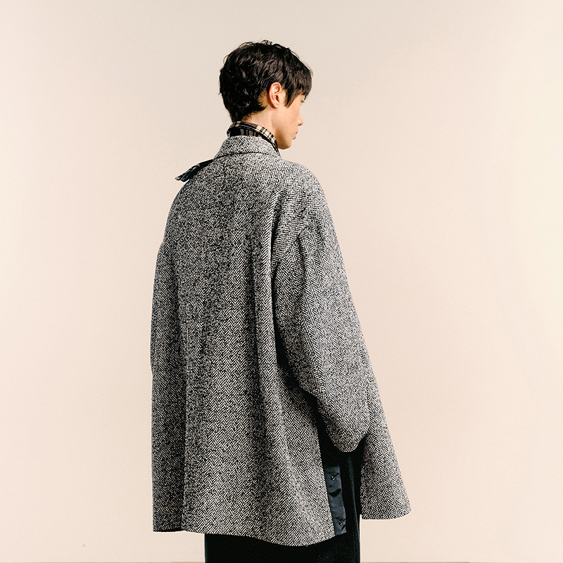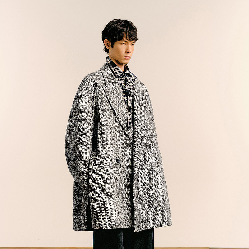 Oversize仿粗纺人字纹大衣,上身后造型感强