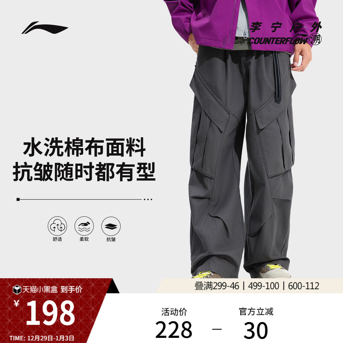 李宁户外CF溯丨休闲裤男冬季新款长裤男装裤子宽松舒适直筒运动裤