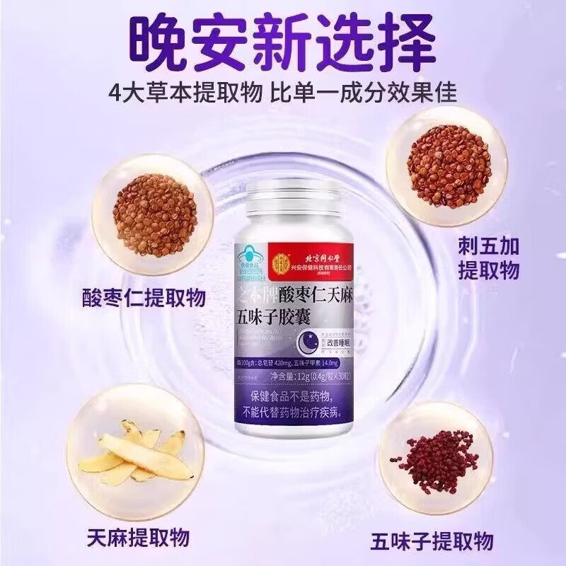 北京同仁堂酸枣仁天麻五味子胶囊多梦改善睡眠差安神舒心正品健康