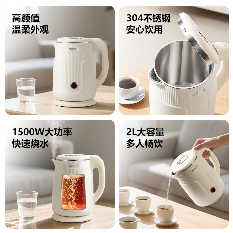 苏泊电热水壶双层防烫烧水壶大容量烧水壶食品级不锈钢快速壶