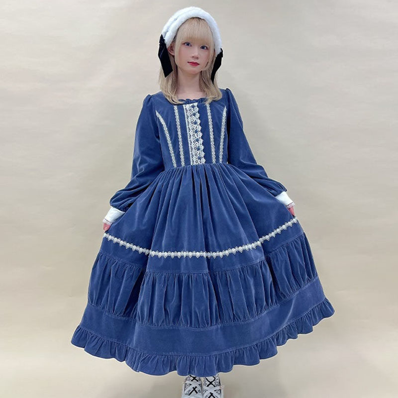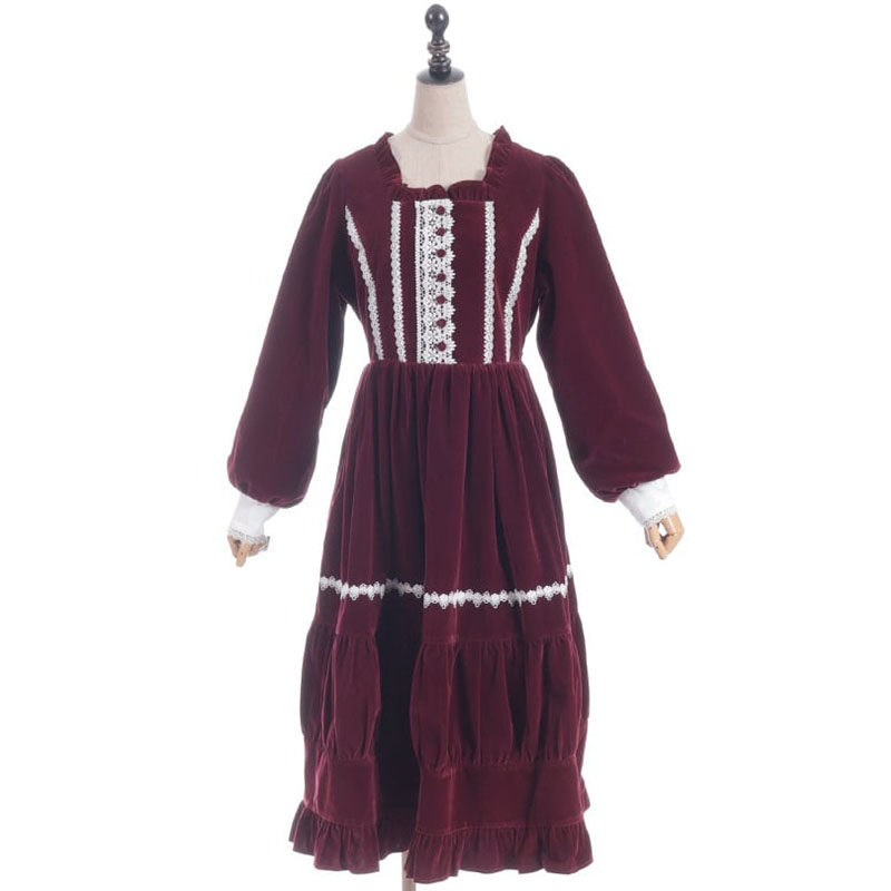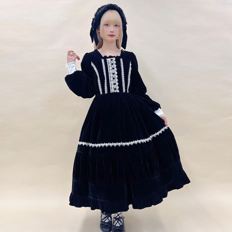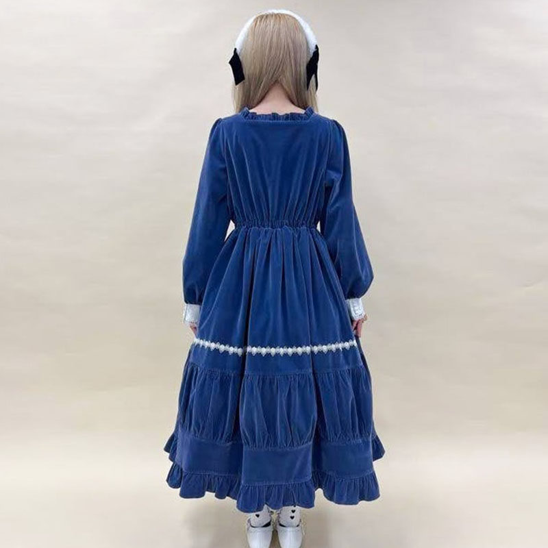 axesfemme复古风优雅蕾丝拼接冬季长袖丝绒Lolita连衣裙LD361X02C