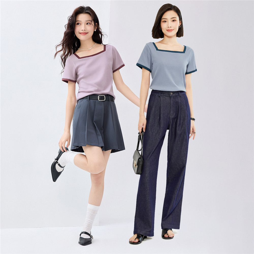 弹力坑条柔软舒适 撞色方领设计时尚减龄
