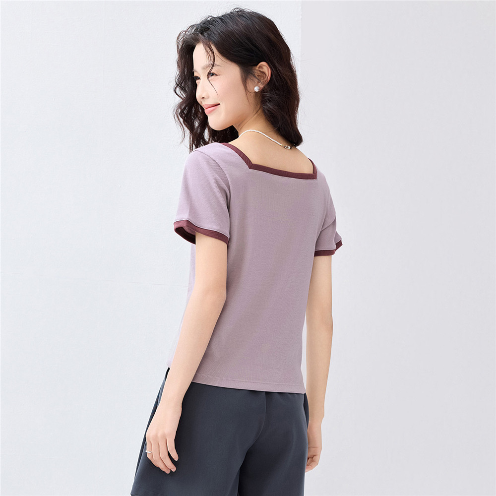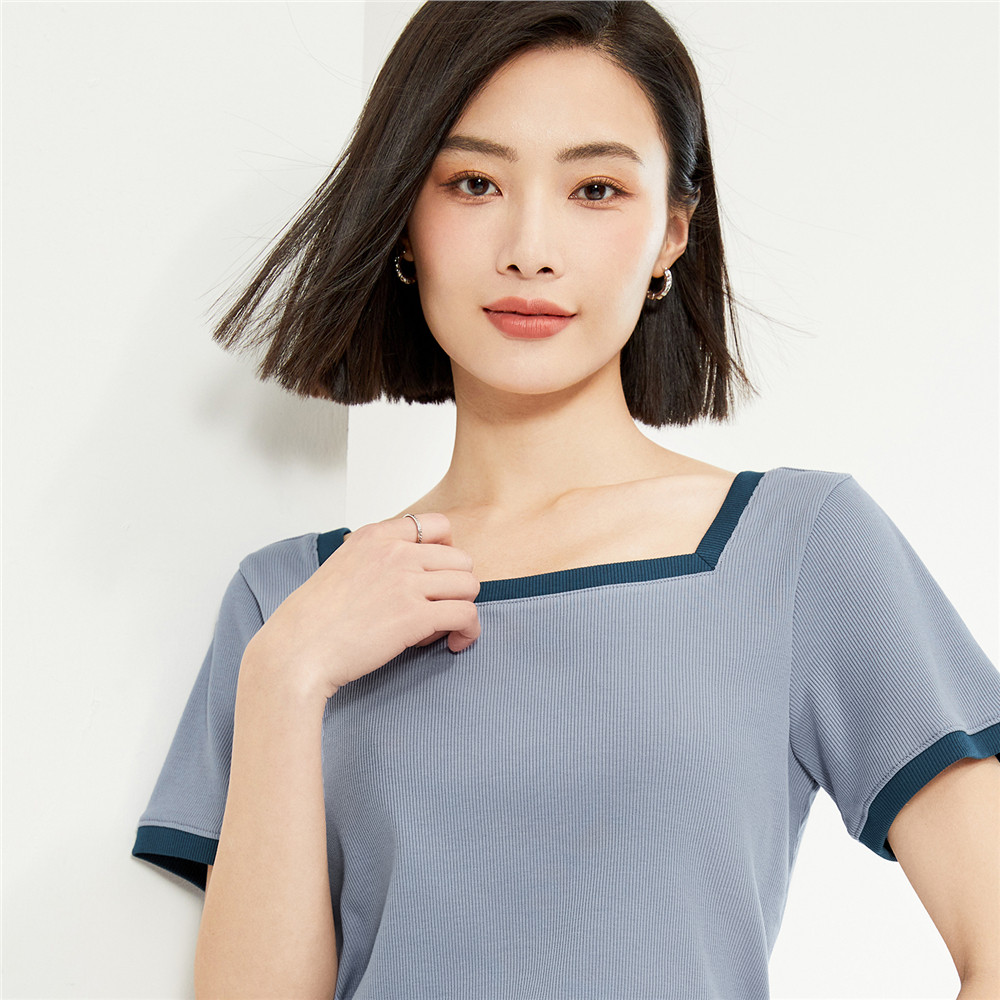 佐丹奴短袖T恤女夏新款弹力坑条减龄撞色方领修身上衣女05325422