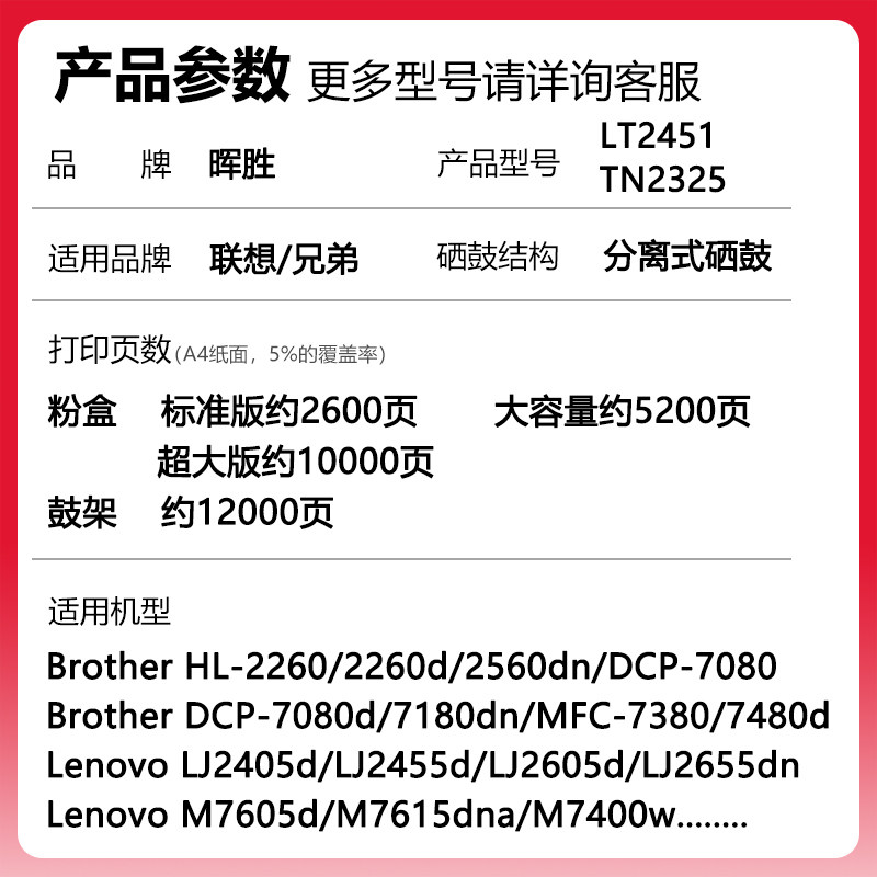 晖胜适用联想M7400Pro硒鼓M7605d LT2451h M7615dna兄弟7080d粉盒MFC7380 dcp7180dn打印机 2260 TN2325墨盒