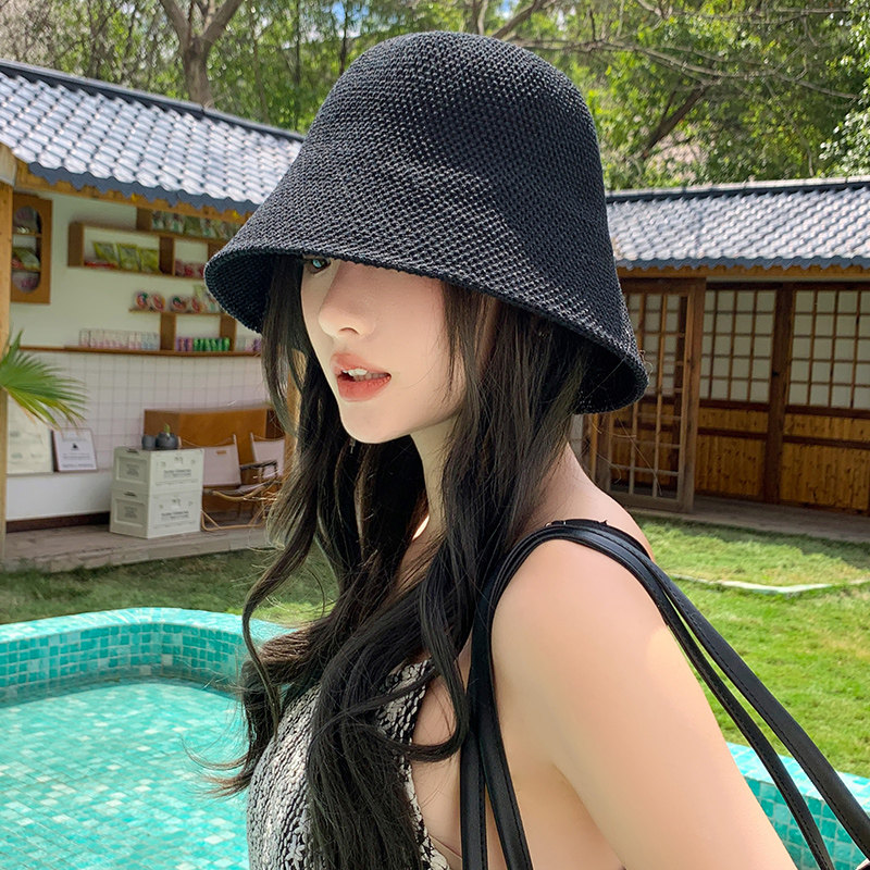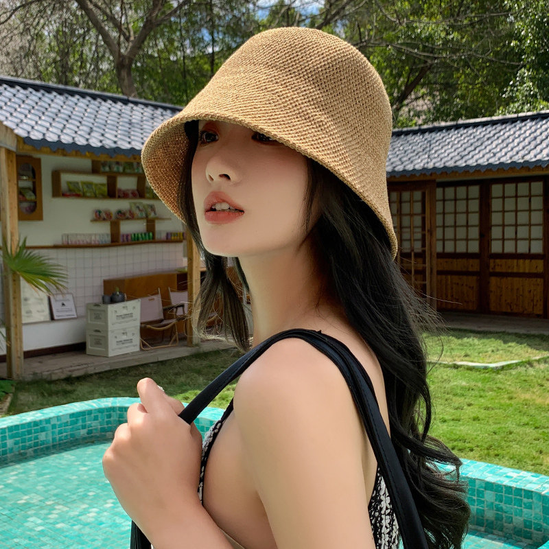 2025新款手工编制草帽时尚遮阳防晒帽子女韩版水桶渔夫帽镂空透气