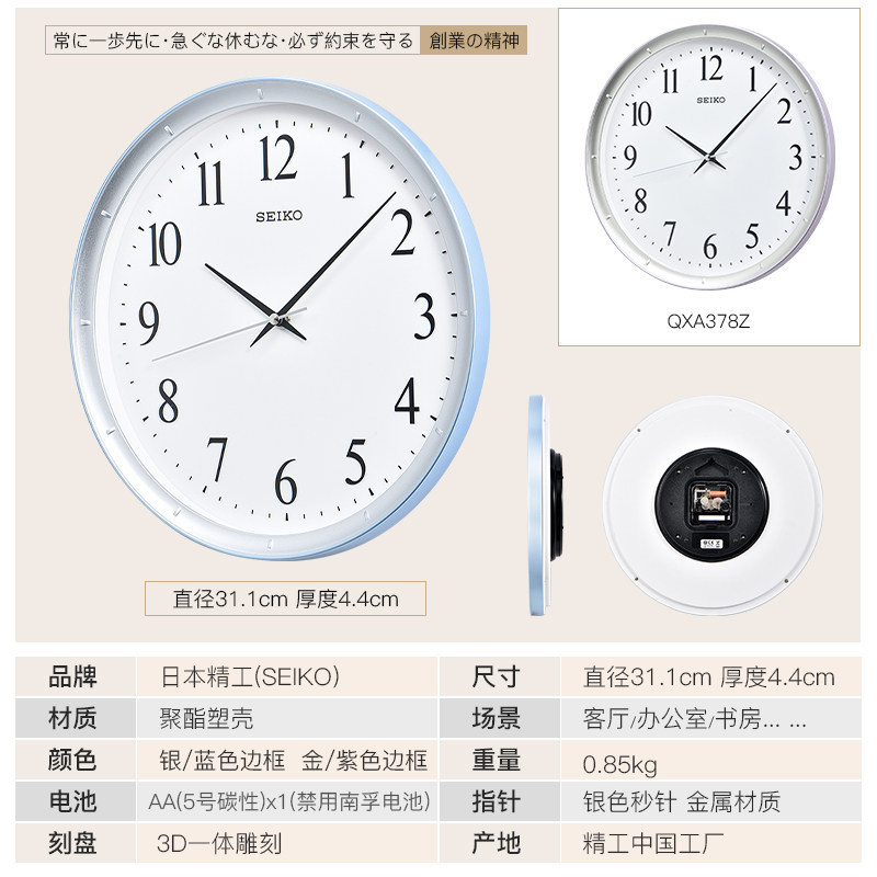 SEIKO精工12英寸时尚现代简约钟表卧室客厅静音扫秒家用挂钟