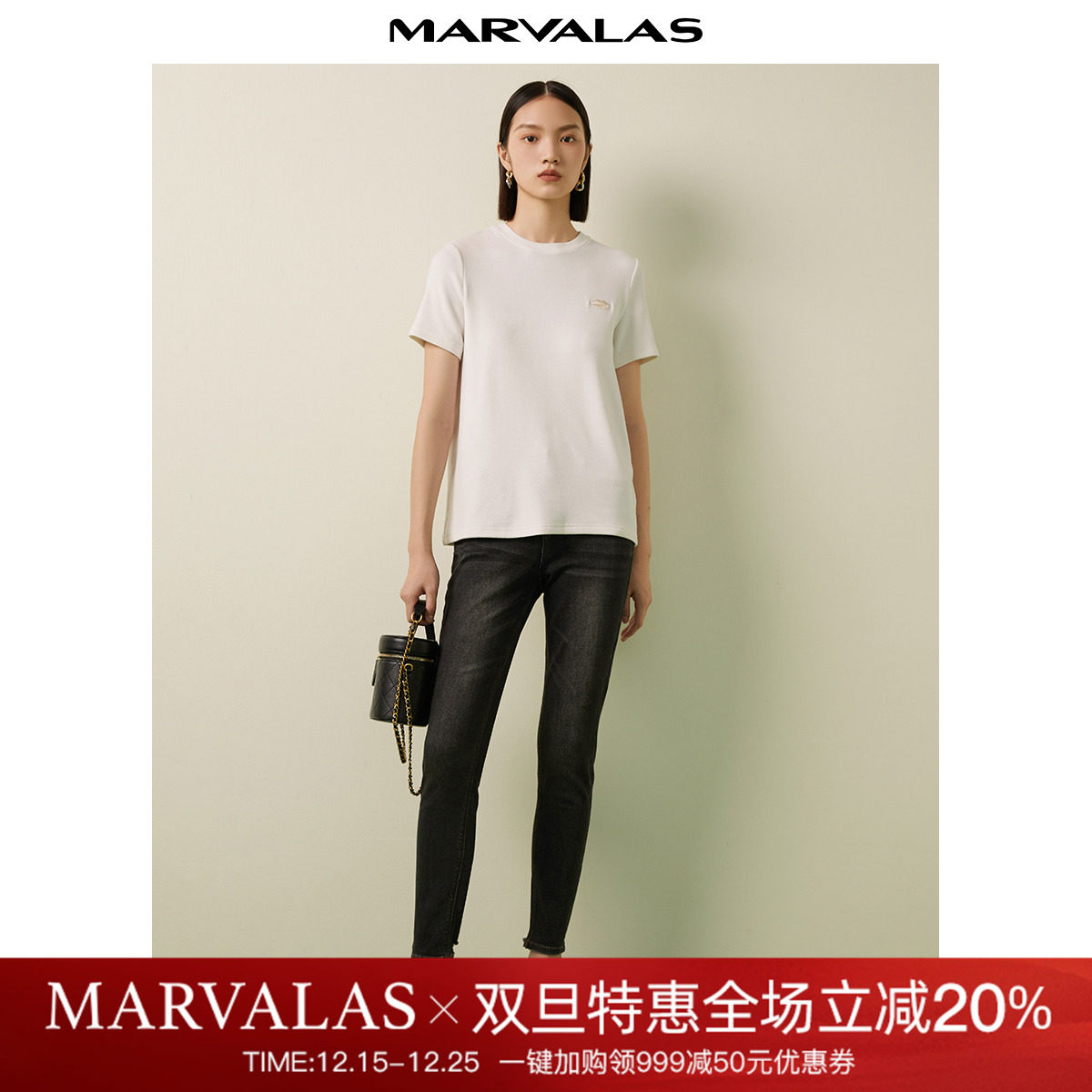 曼德诗高腰牛仔裤女2025秋季新款做旧感水洗棉长裤显瘦小脚裤