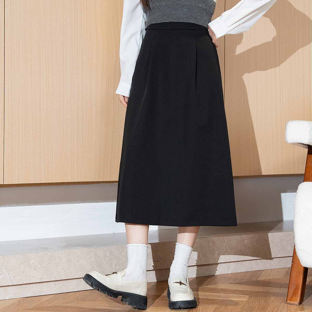 唐狮秋冬季新款女半身裙高腰显瘦开叉百搭黑色a字长款裙子TE