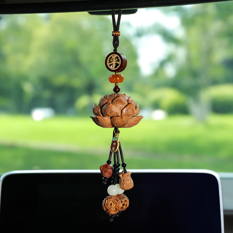 精品汽车挂件手工雕刻桃木莲花车载挂饰出入平安串珠原创吊坠车挂