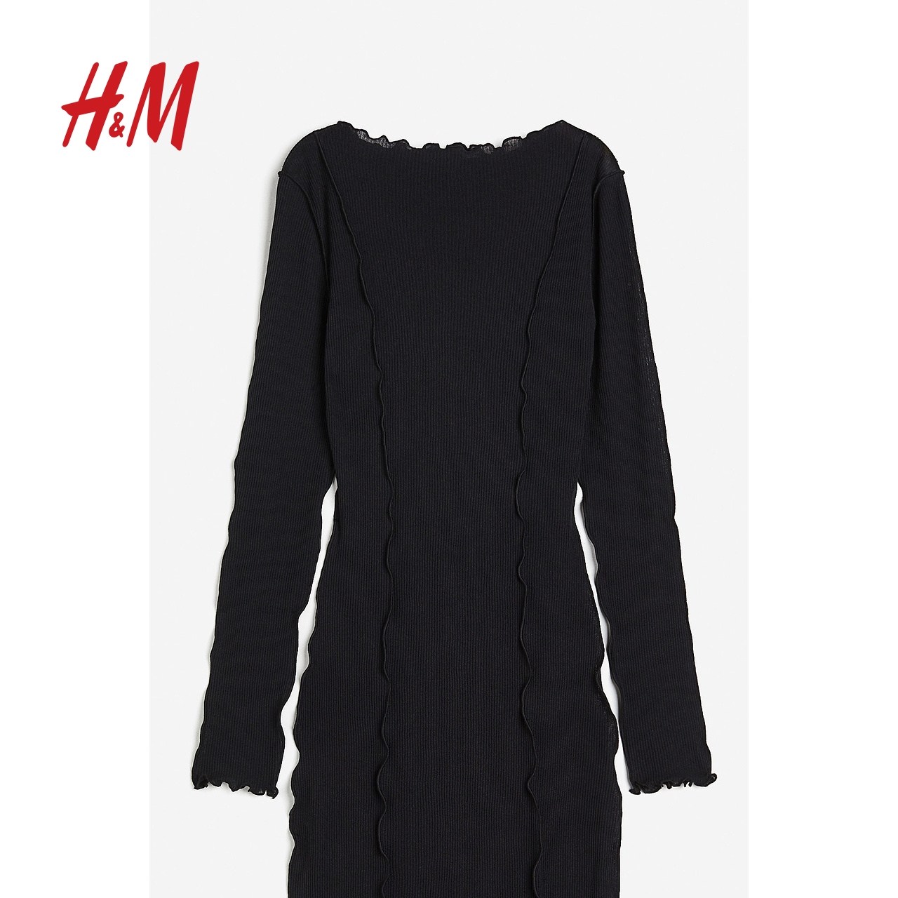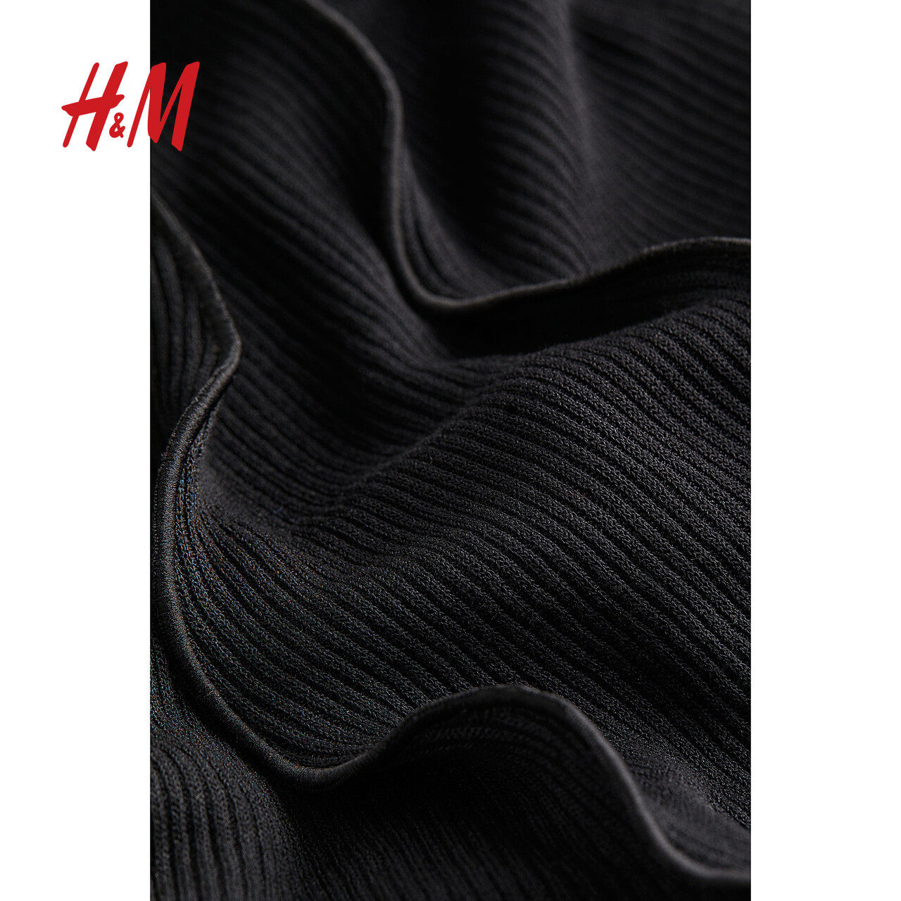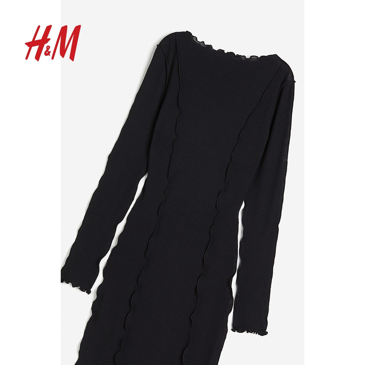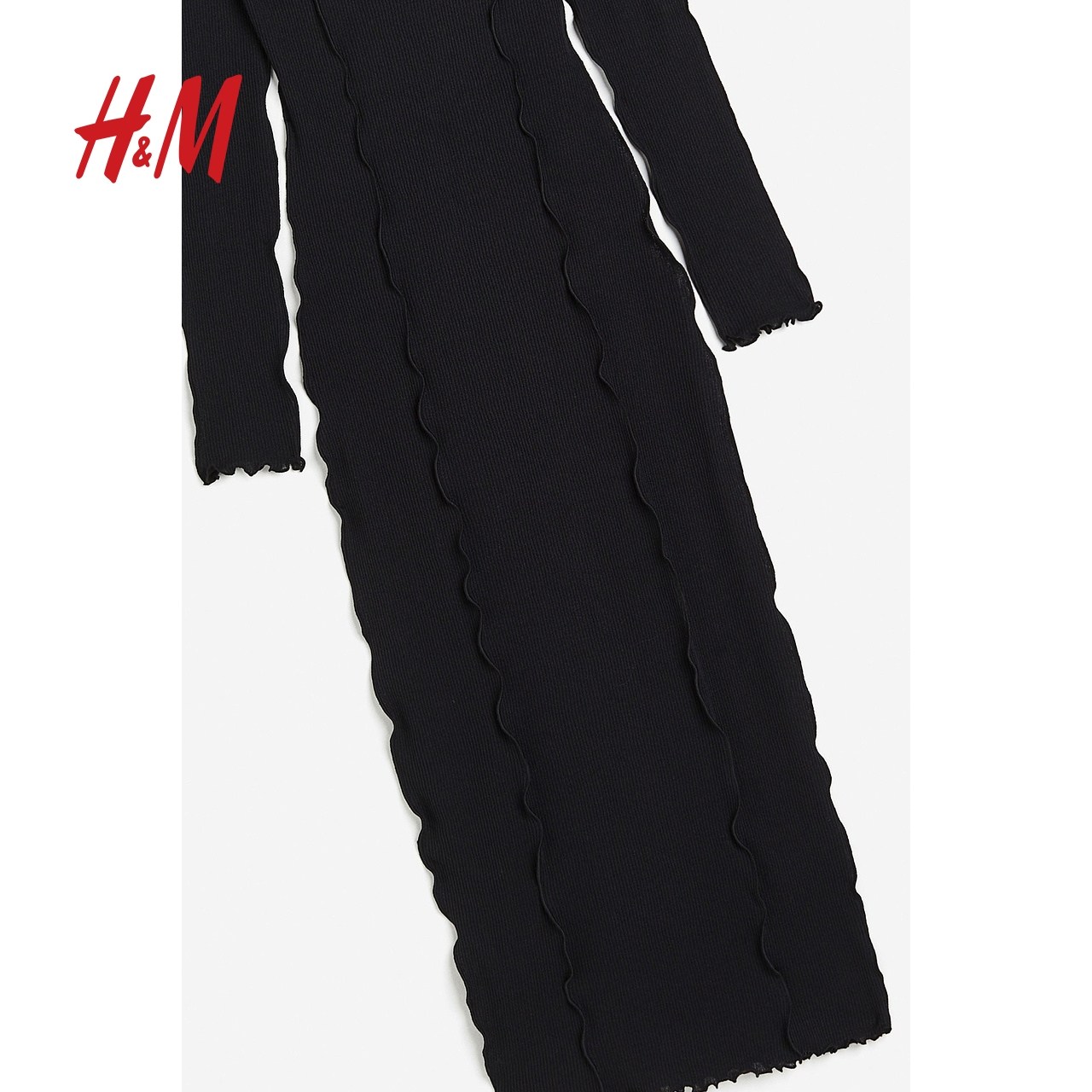 HM女装连衣裙冬季修身优雅气质一字领中长针织裙1203920