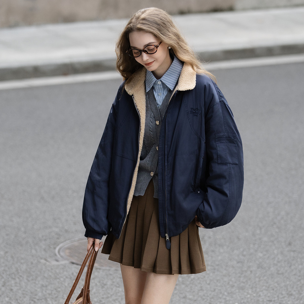 唐狮秋冬季短款厚外套女撞色仿羊羔绒领子短款棉衣保暖夹克TUTA