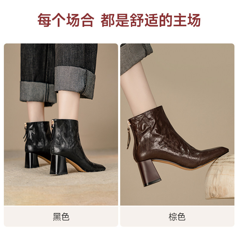 棕色靴子!小个子内增高7CM法式方头靴2025冬新款绒面粗跟短靴女
