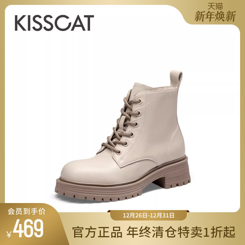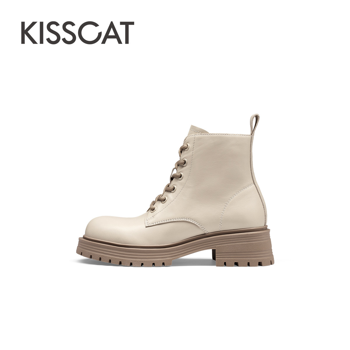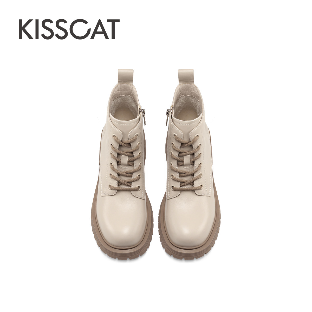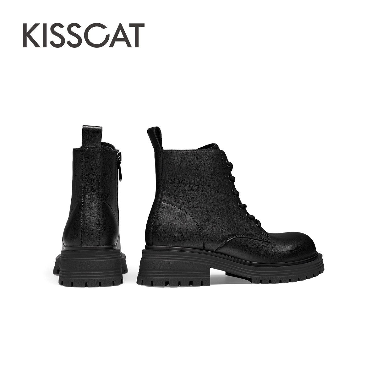 接吻猫秋季新款经典休闲百搭短筒靴时尚户外简约鞋带马丁靴女