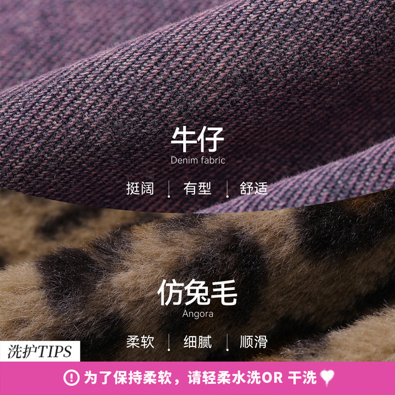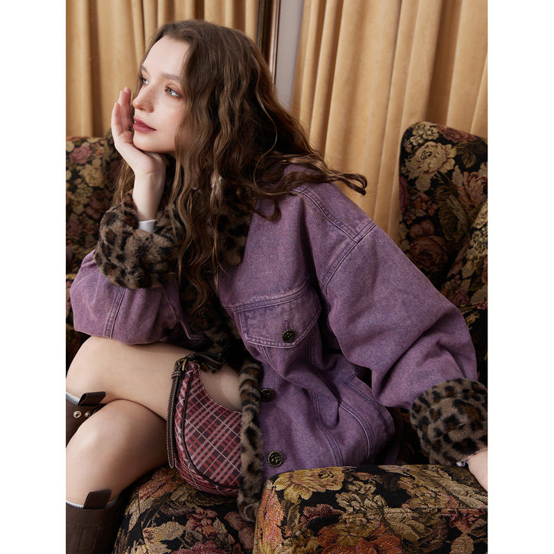 妖精的口袋毛绒豹纹拼接紫色牛仔棉衣女2026冬季新款夹棉新年外套