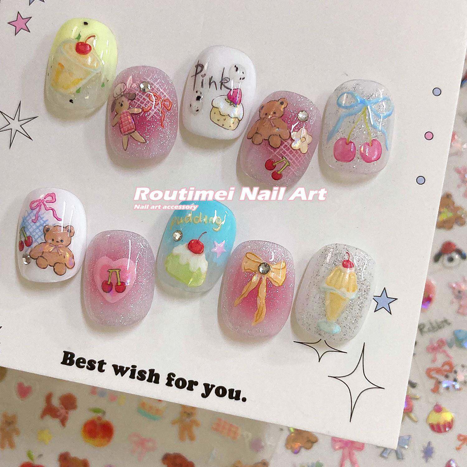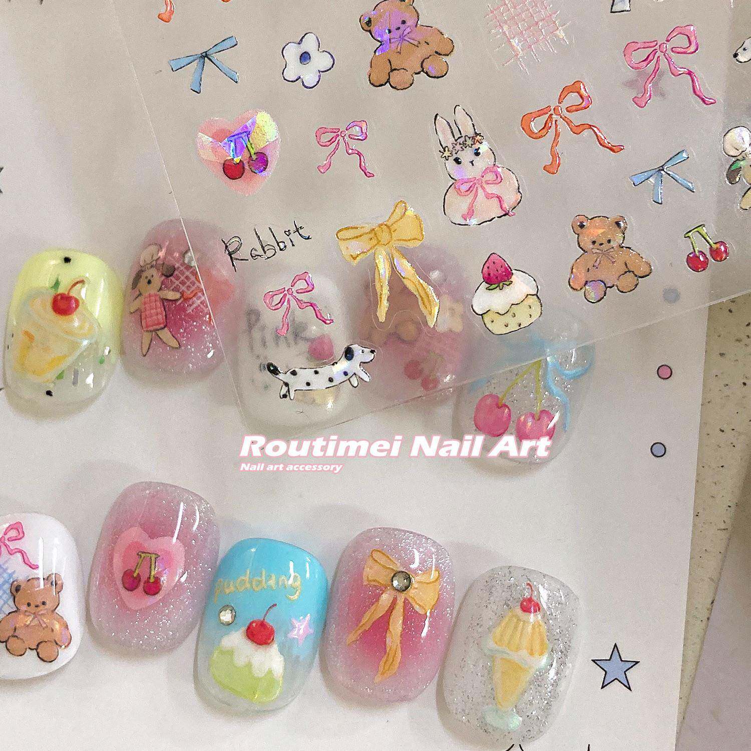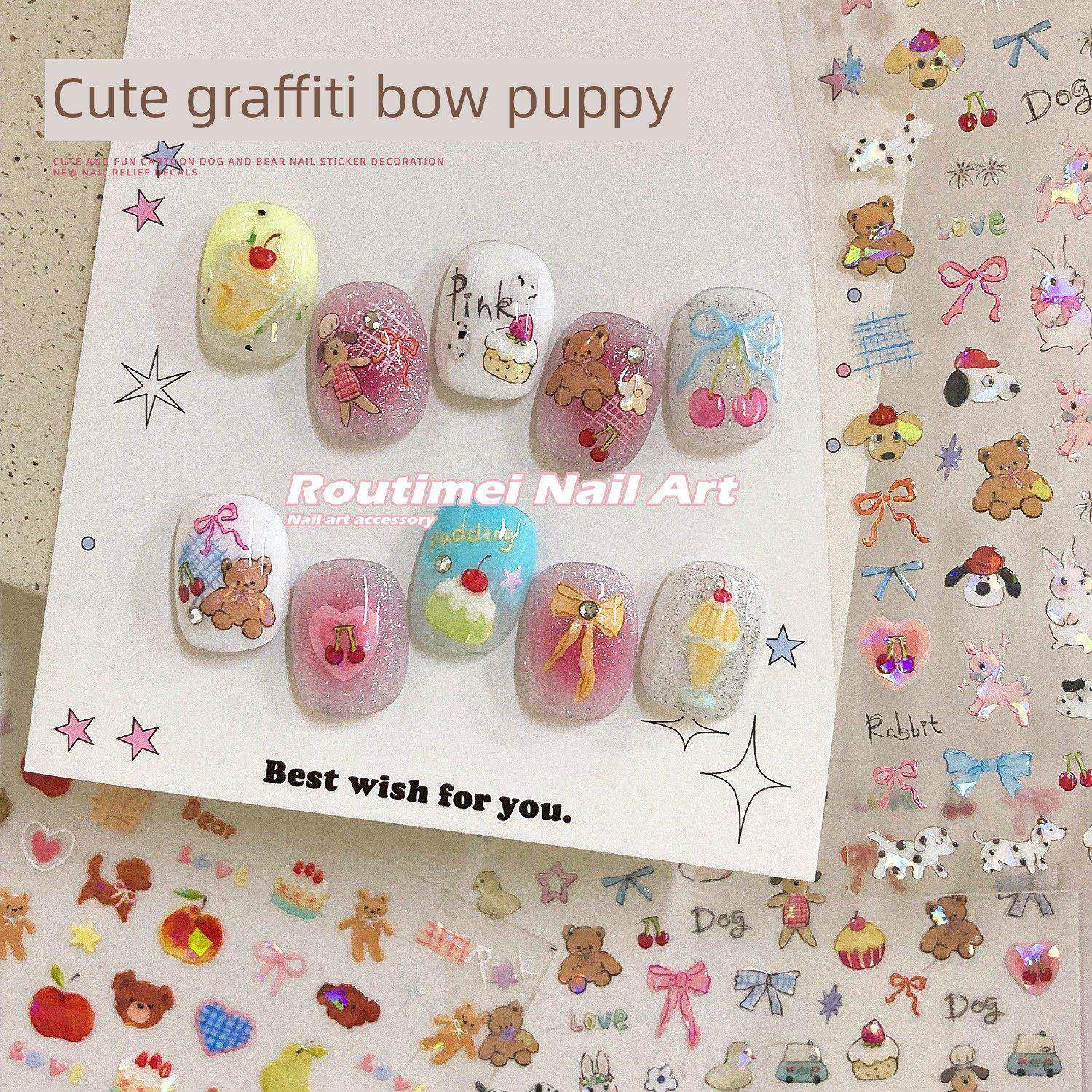 儿童美甲贴无毒无味女孩涂鸦狗狗纸tomoni卡通斑点狗贝壳光粉粉兔兔背胶指甲贴