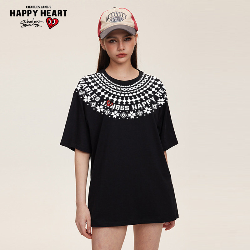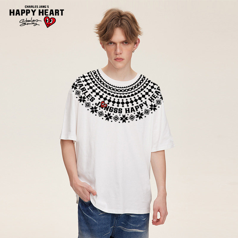 查尔斯桃心 美式短袖t恤男费尔岛民族风项链印花纯棉夏季圆领上衣