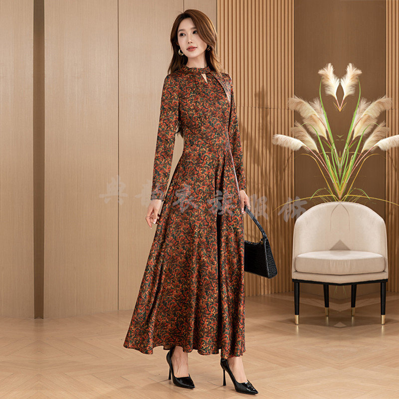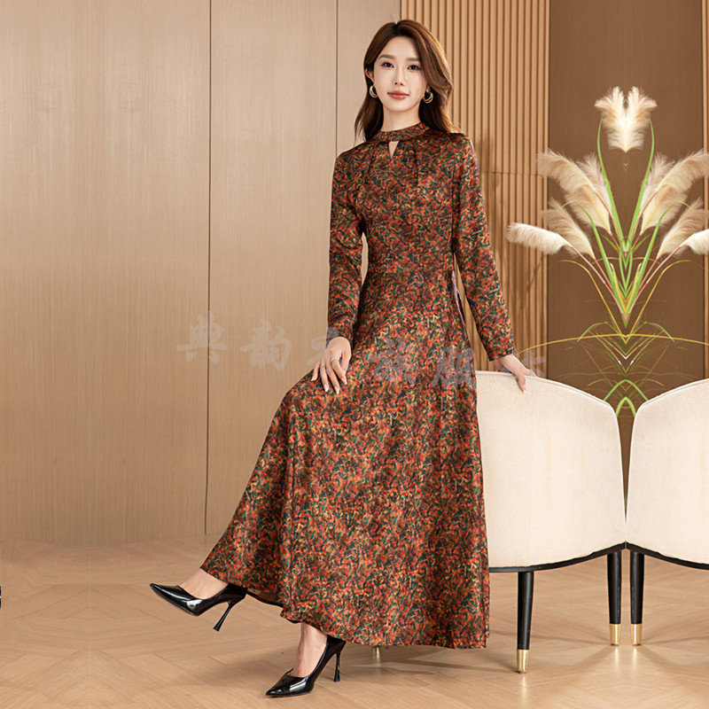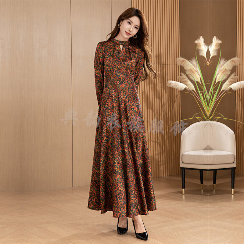 香云纱连衣裙超长款春秋冬季2025年新款长袖气质过膝长裙大摆收腰