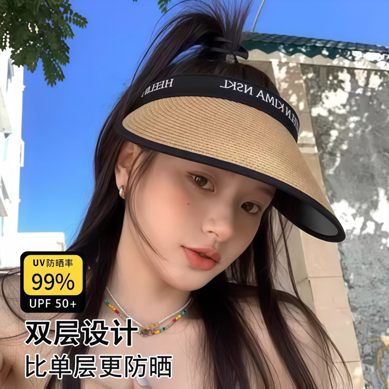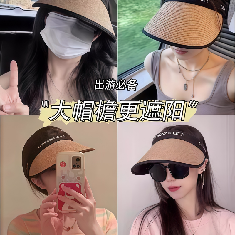 空顶防晒帽女夏季黑胶草帽夏季沙滩海边防紫外线专业遮阳帽大帽檐