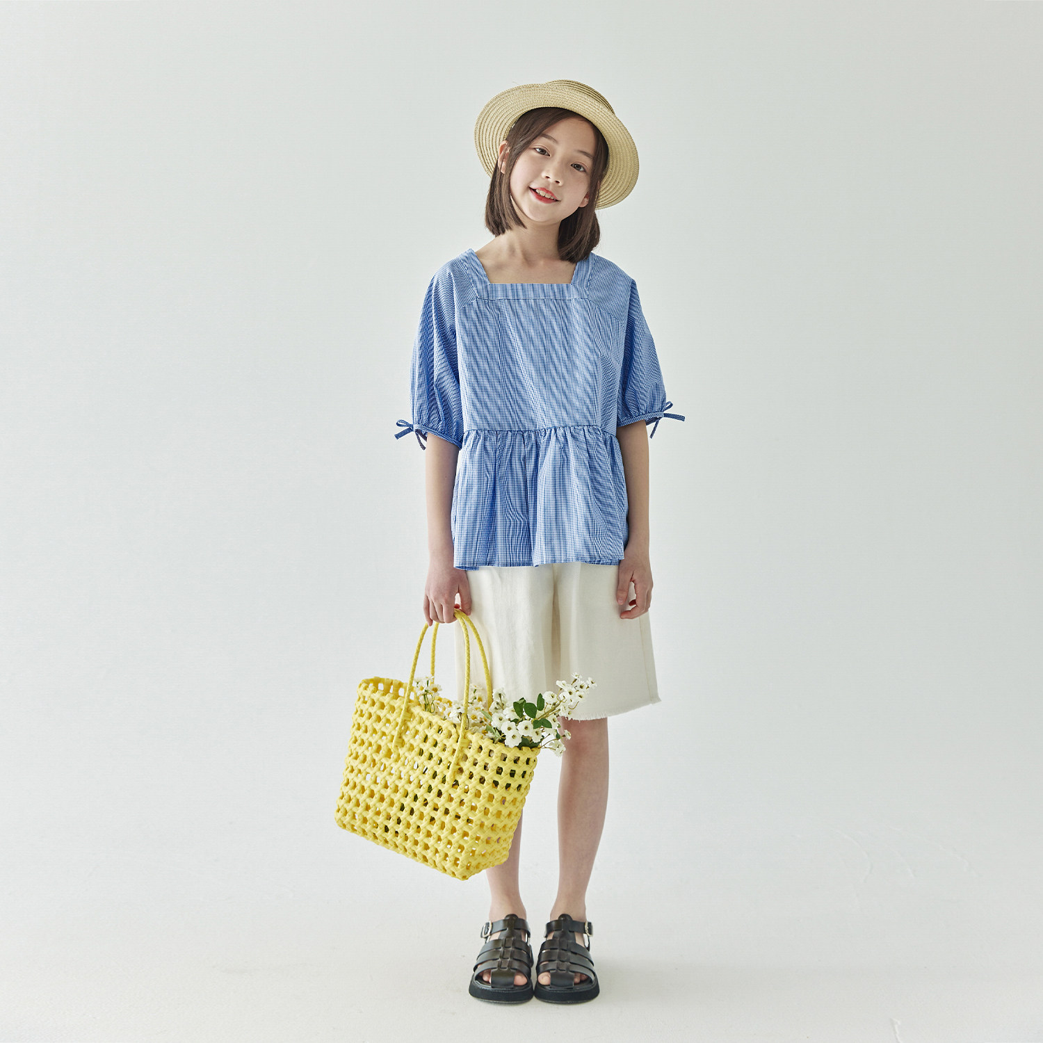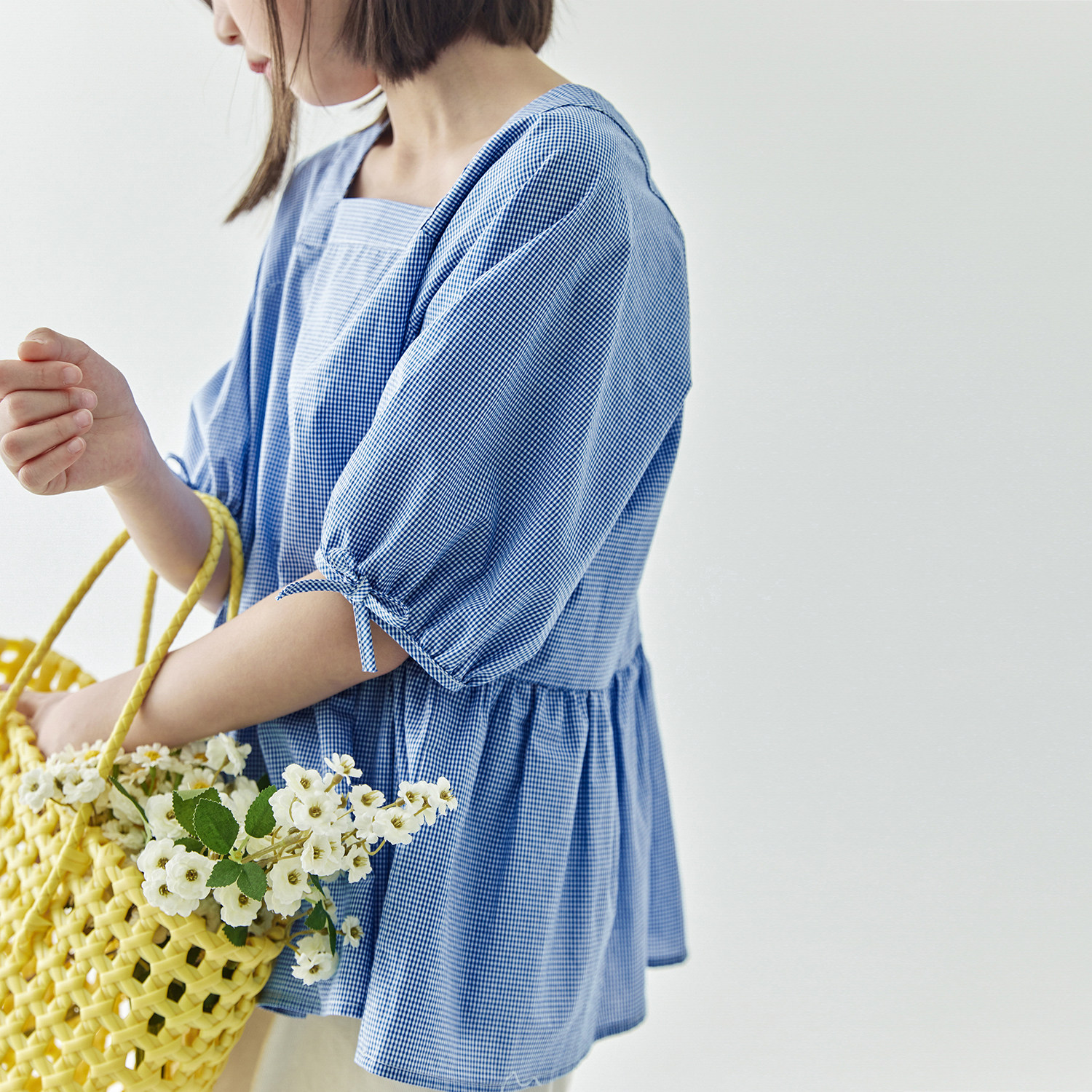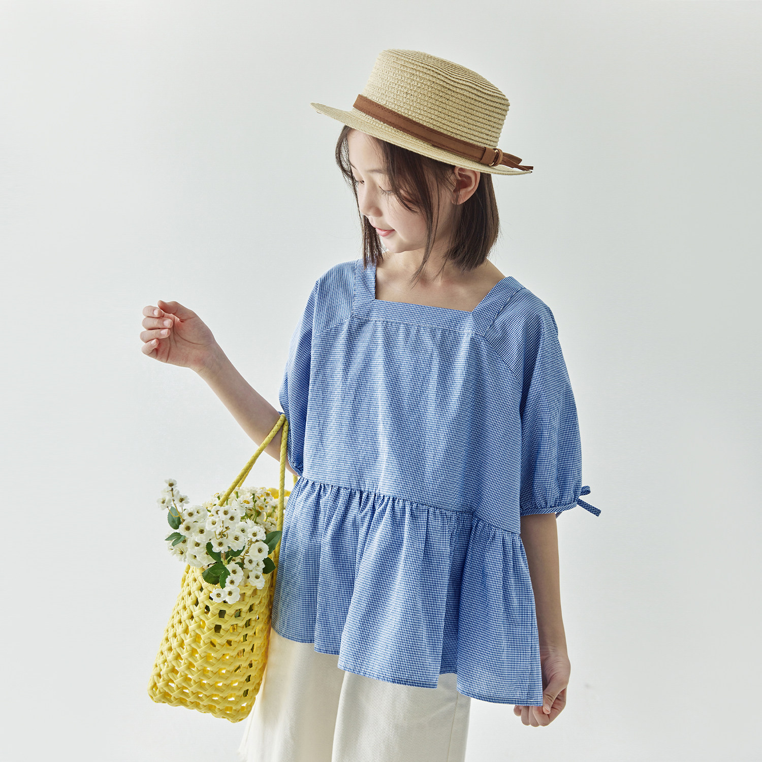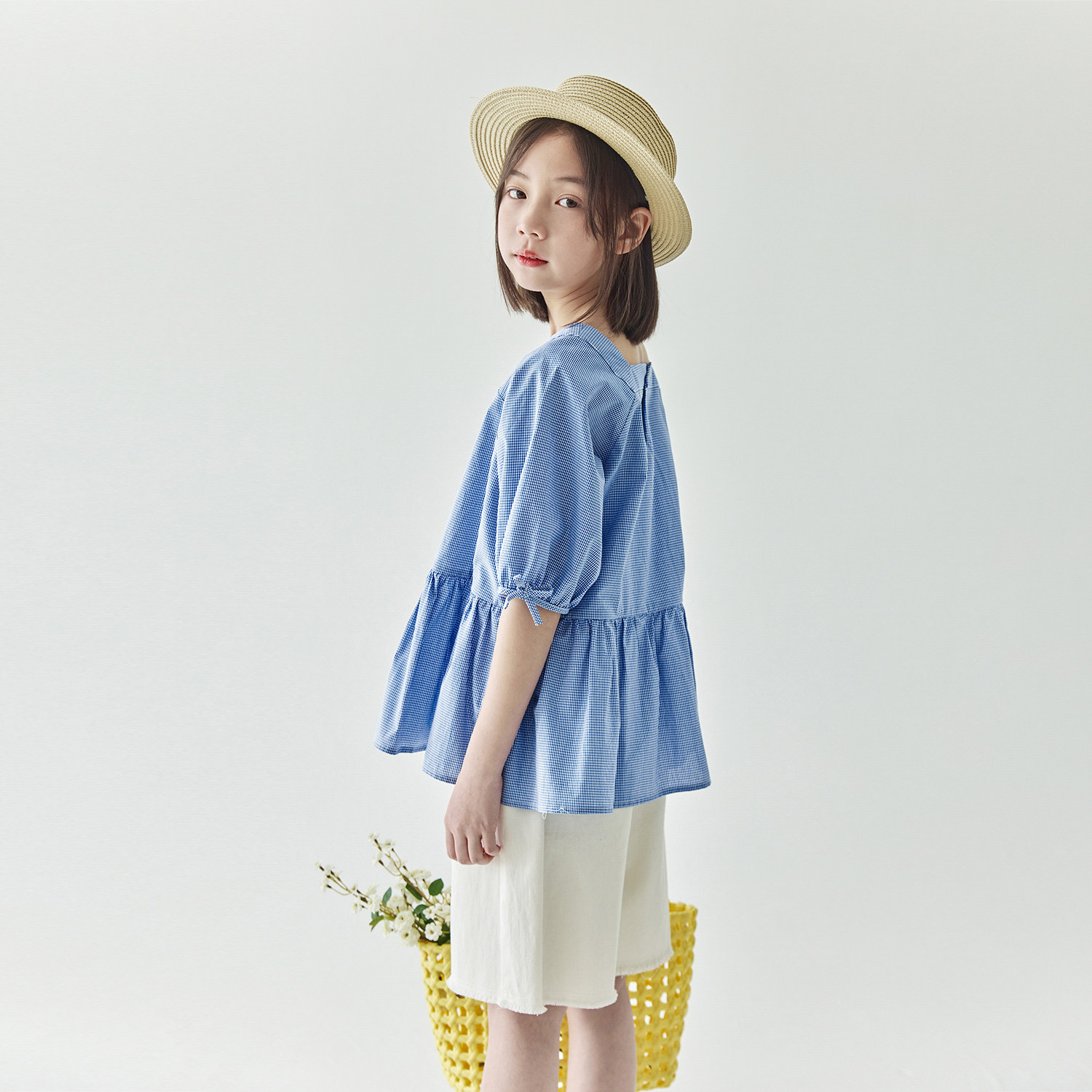 棵初2025夏季新品儿童复古文艺蓝白格纹小衫亲子款泡泡袖方领上衣