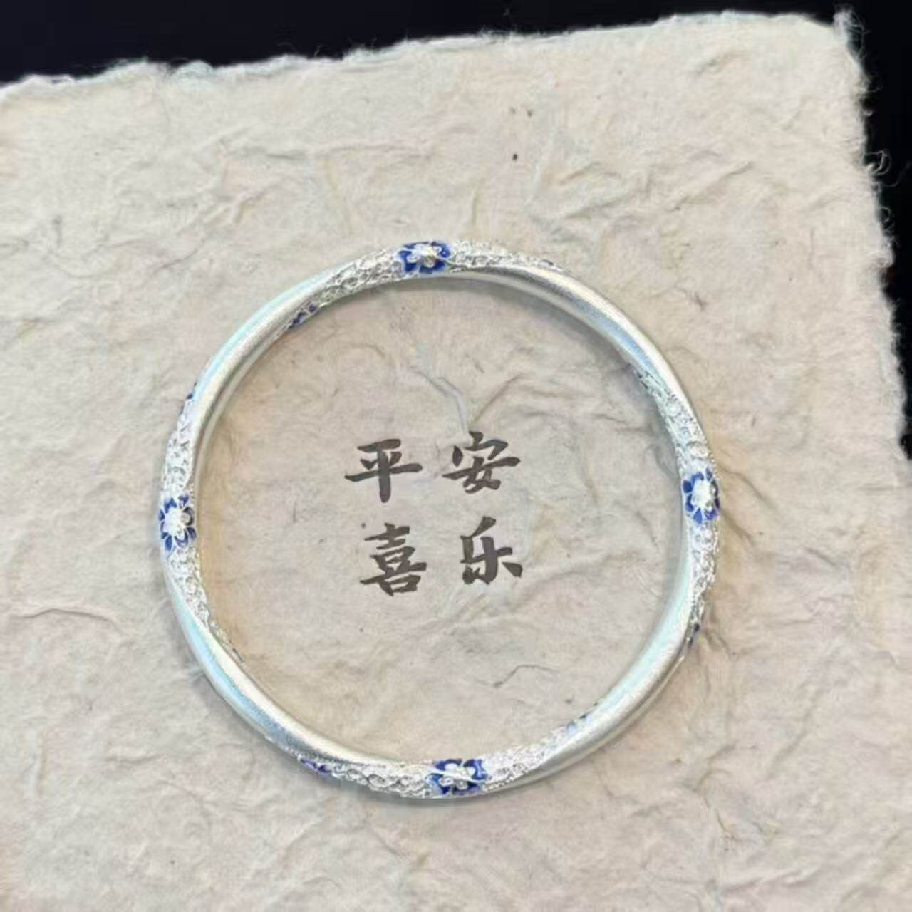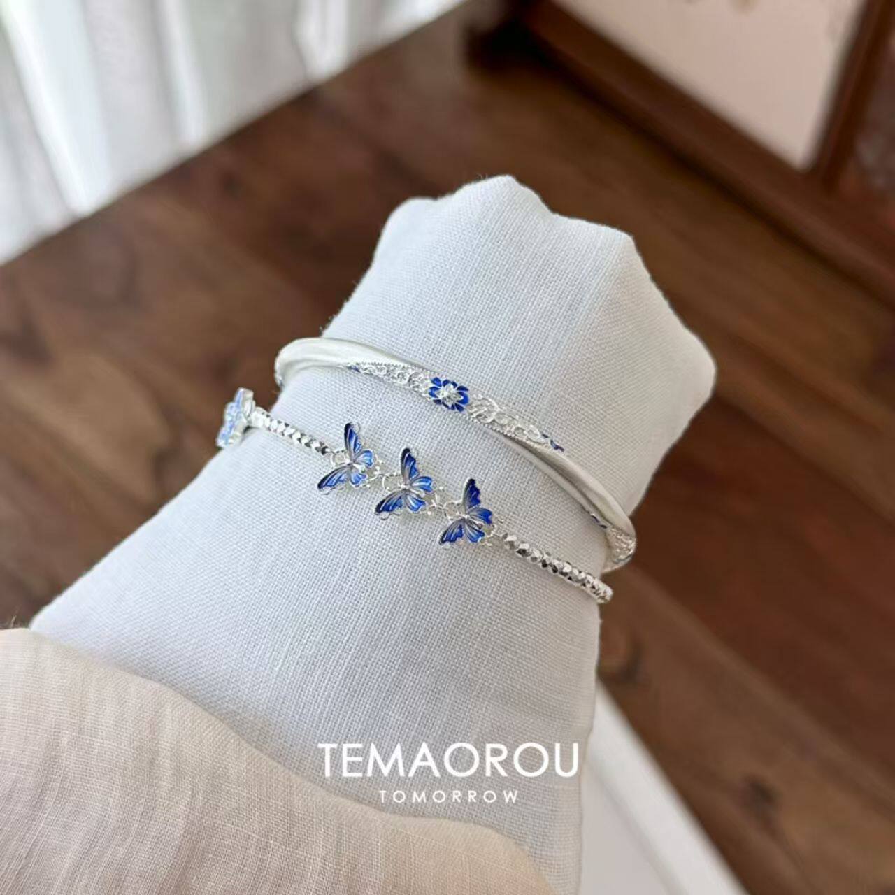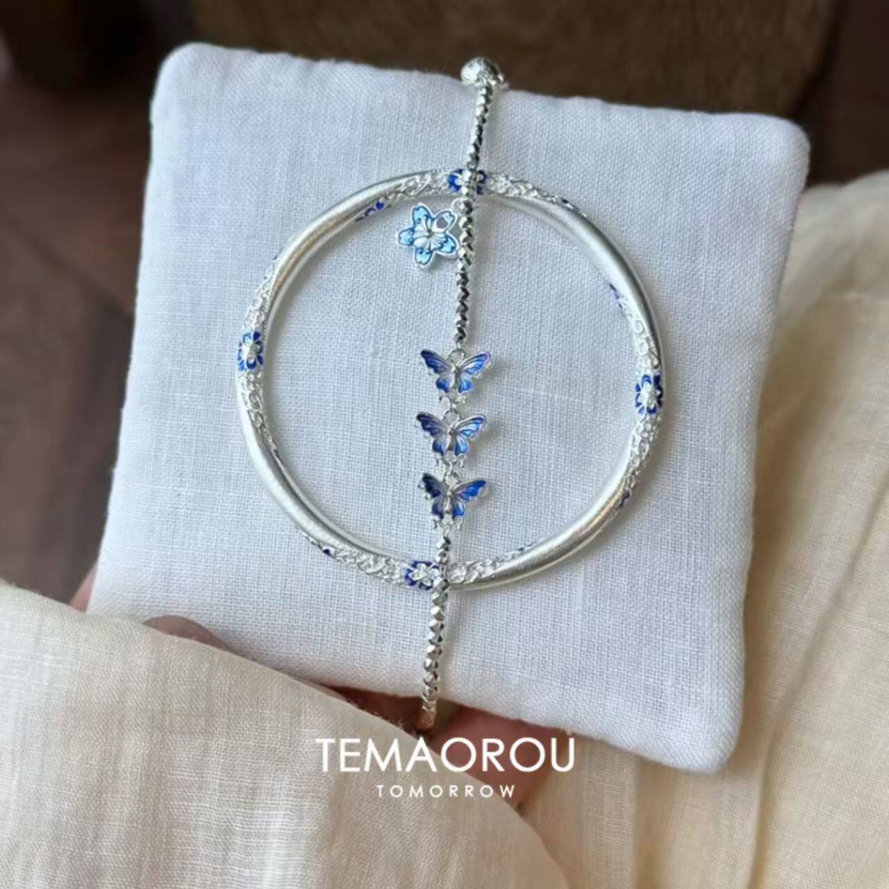 清冷感"蓝花蝶"叠戴蓝蝶银色手链女素圈蓝花银色手镯新中式民族风