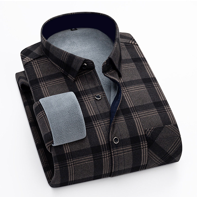冬季新款男士长袖加绒保暖格子中老年条纹衬衫休闲衬衣爸爸加厚外