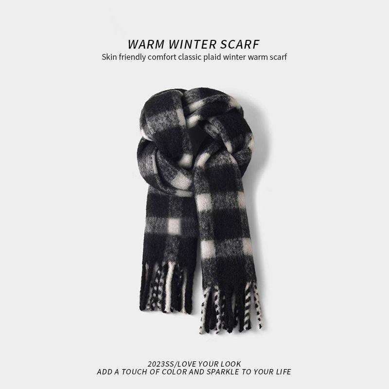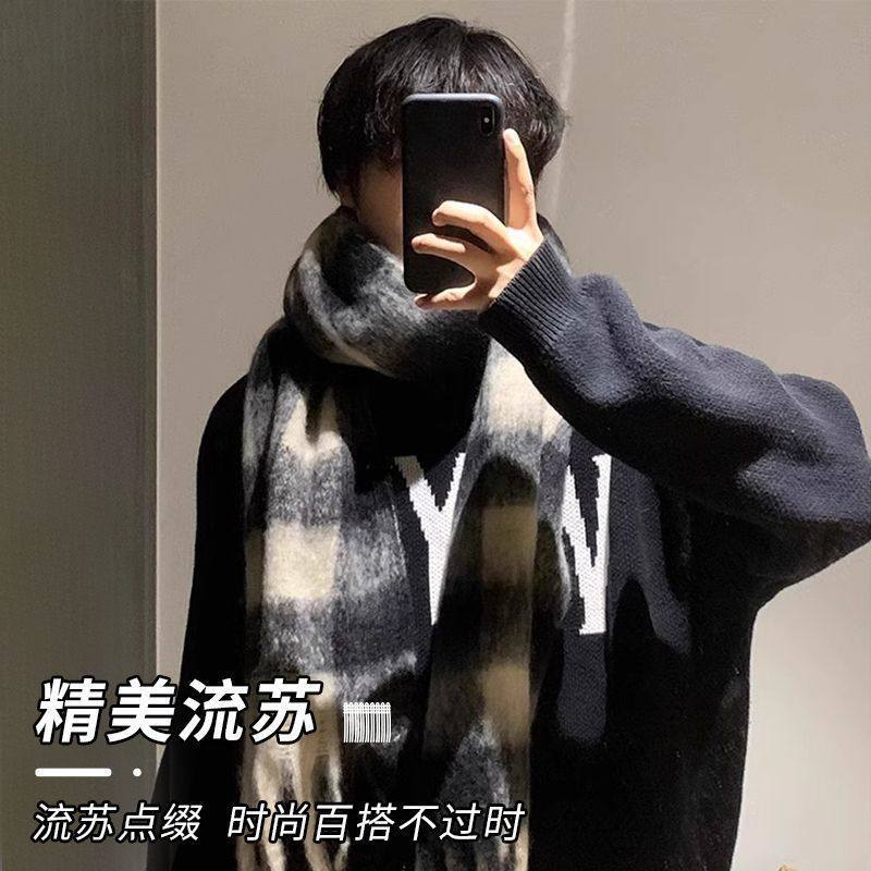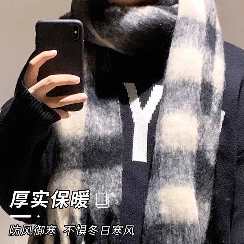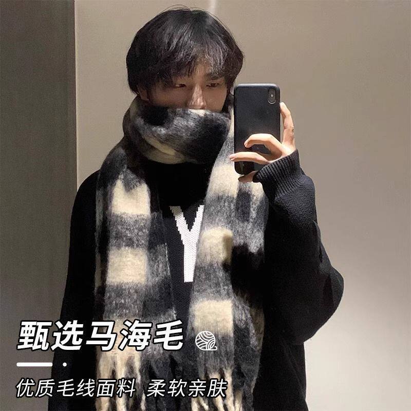 韩版马海毛围巾男冬季2025新款百搭黑白格子披肩保暖加厚高档围脖