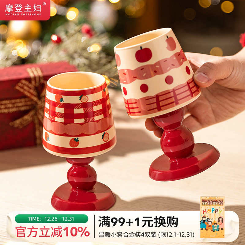 摩登主妇高脚杯陶瓷马克杯红色杯子伴手礼马年新年本命年礼物水杯