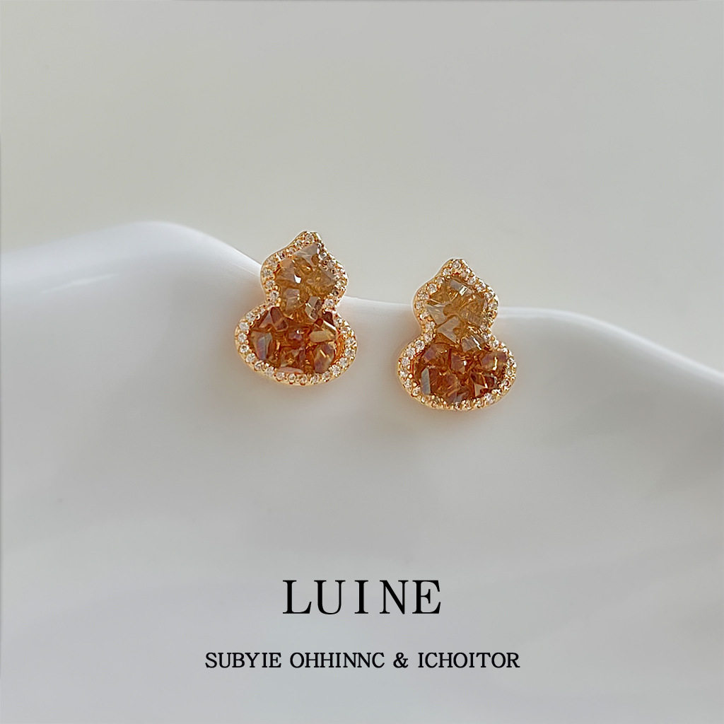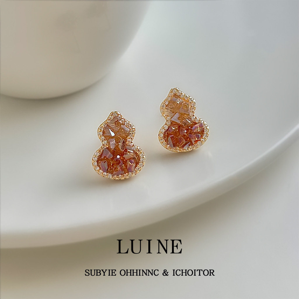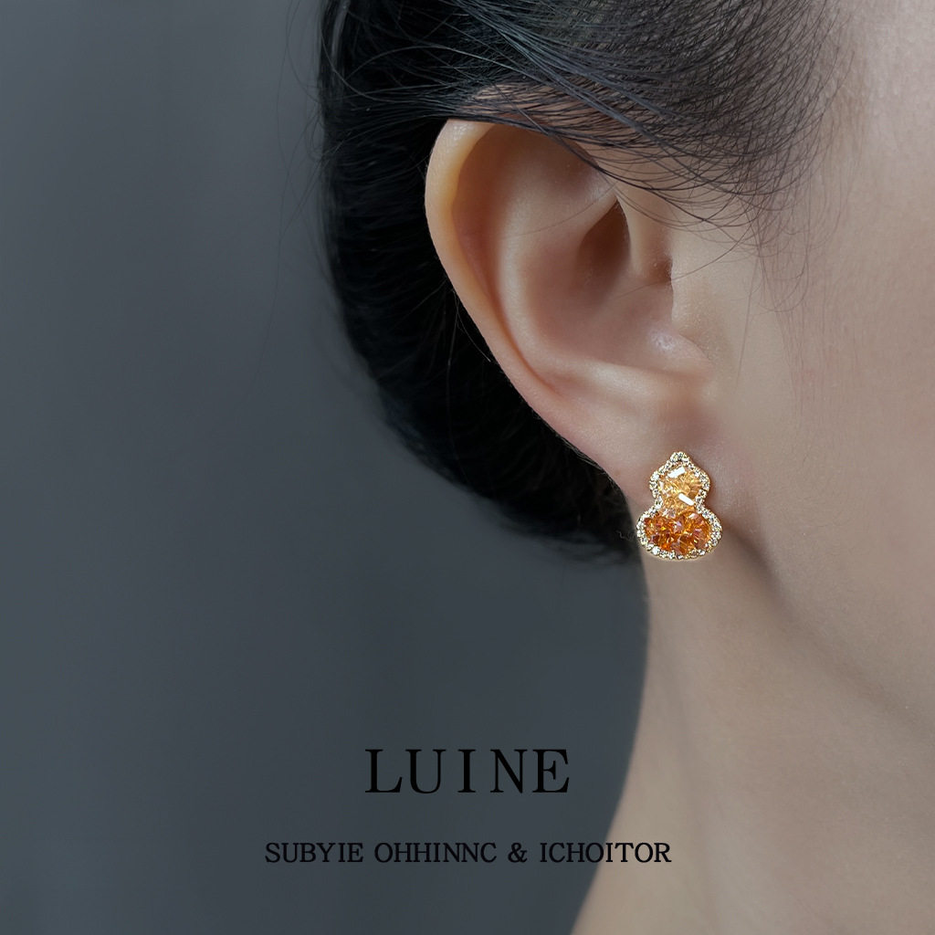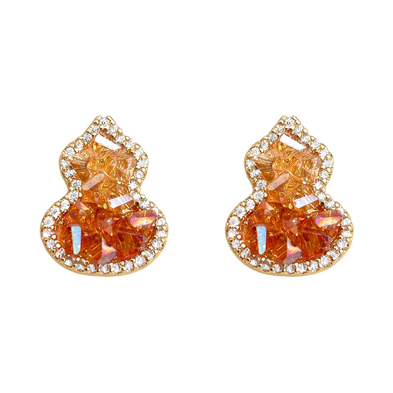 微镶锆石925银针水晶葫芦耳钉橙色渐变香槟色耳饰耳洞