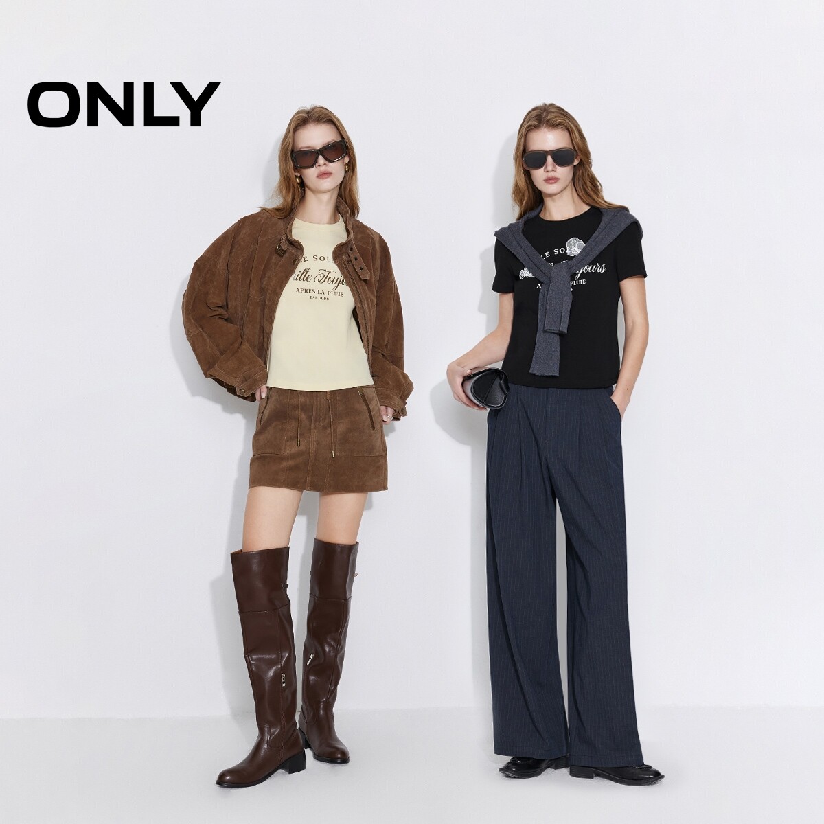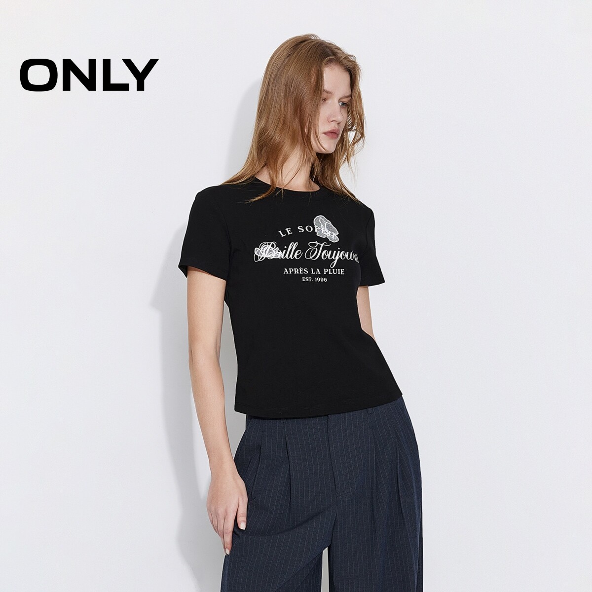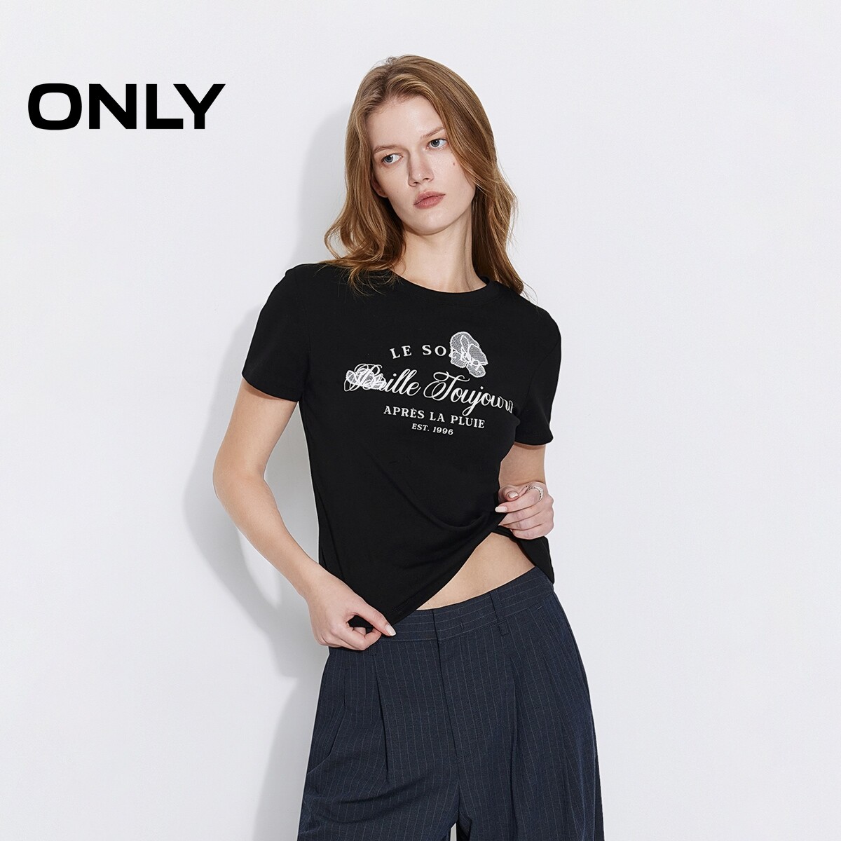 ONLY2026春季新款独特蕾丝刺绣艺术感字母印花正肩舒适上衣T恤女