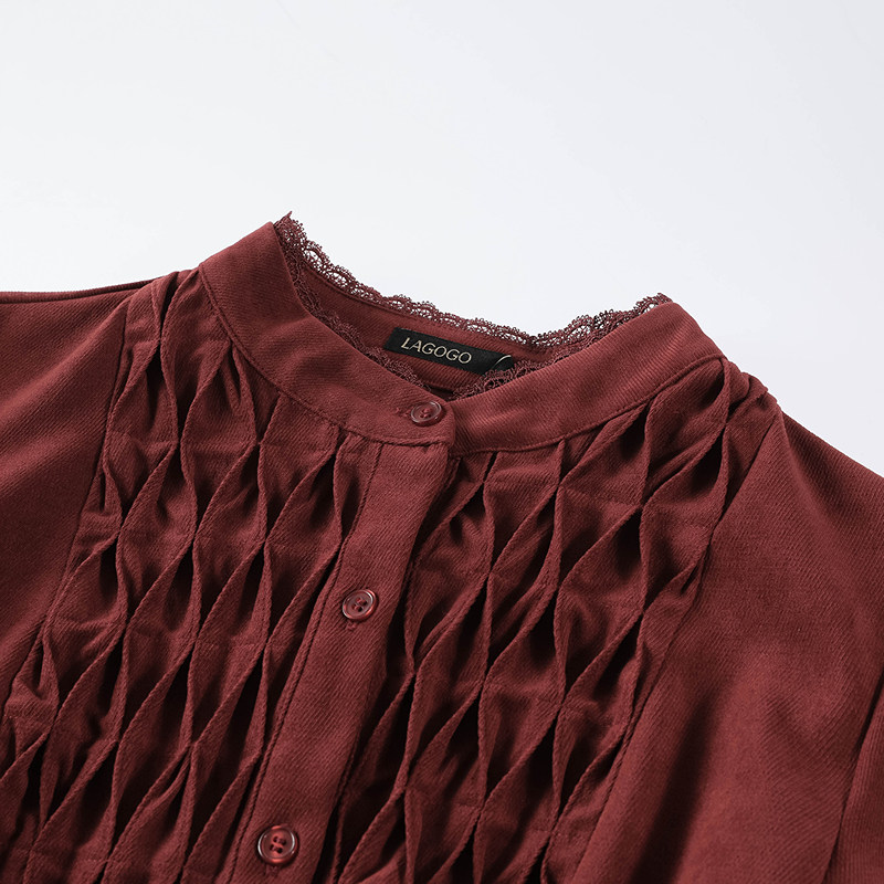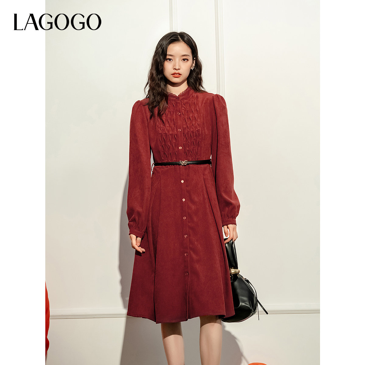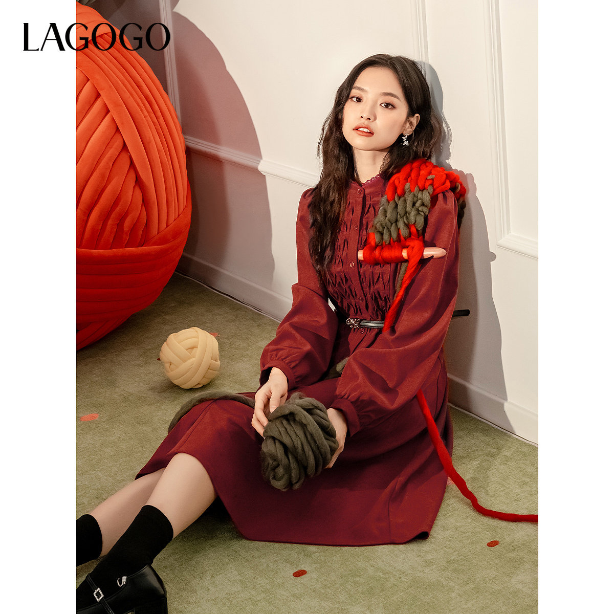 LAGOGO安可拉红收腰连衣裙女拉谷谷2025秋冬新款法式花边圆领裙子