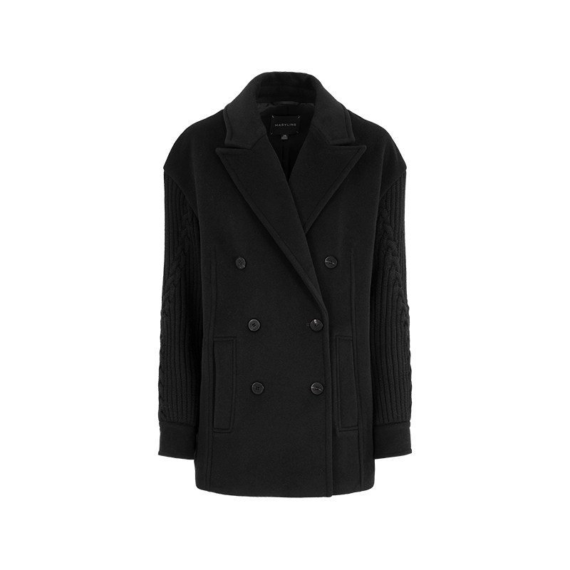 MARYLING玛俪琳冬新品黑色尖翻领双排扣毛织袖外套A1EHW93370