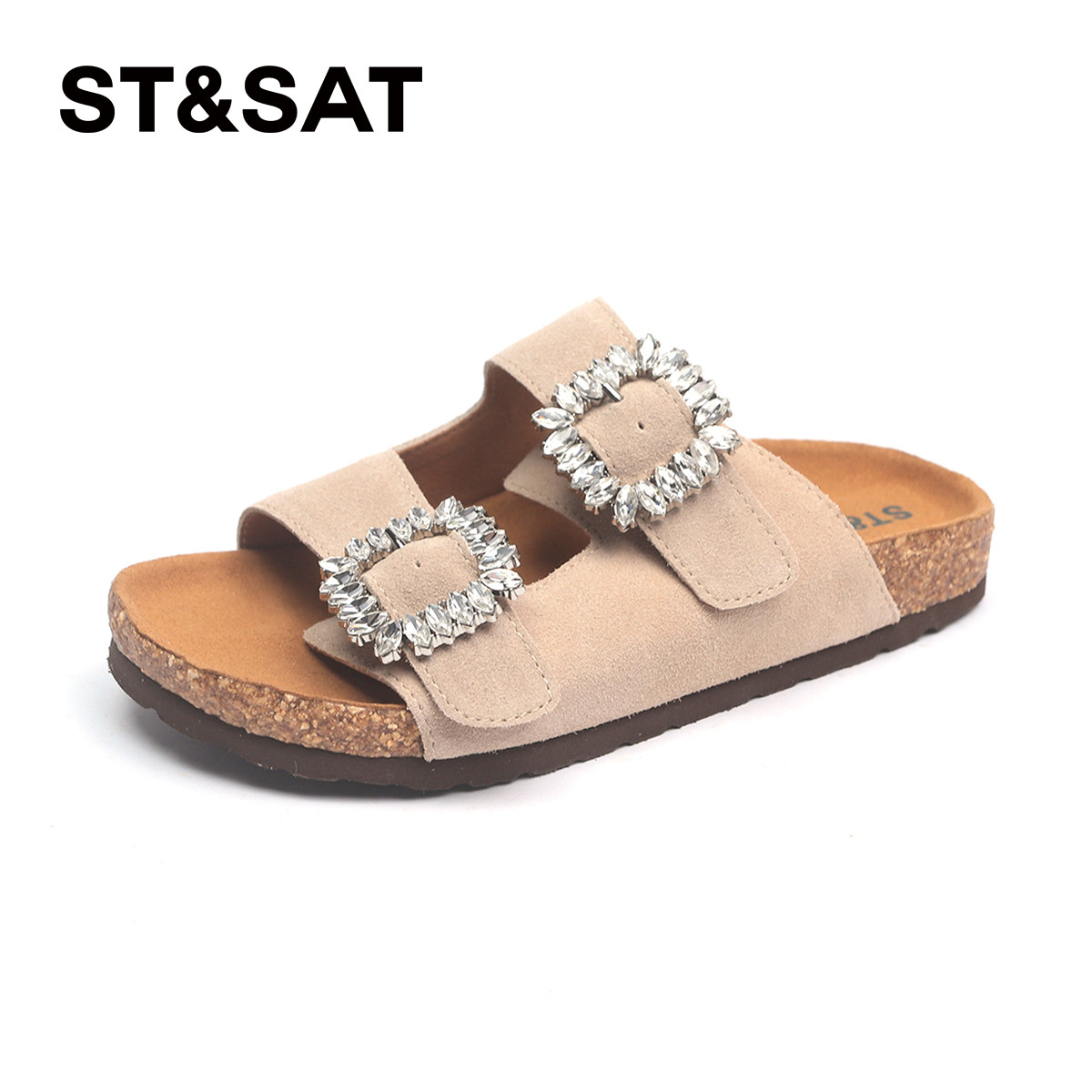 星期六水钻勃肯凉鞋女2025夏季新款复古厚底软木沙滩拖鞋外穿