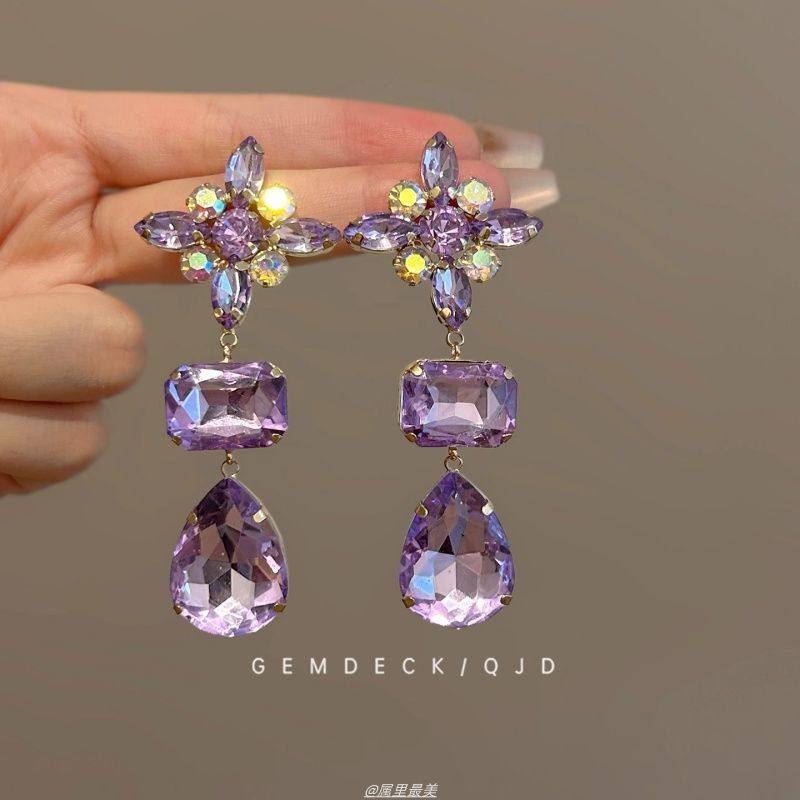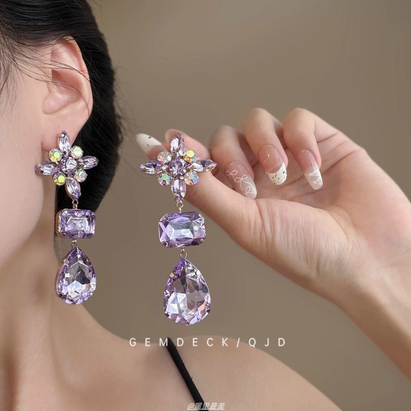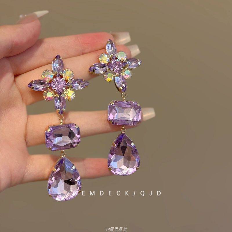 宫廷风紫色水晶花朵流苏耳环巴洛克重工水滴耳坠名媛聚会耳钉耳饰
