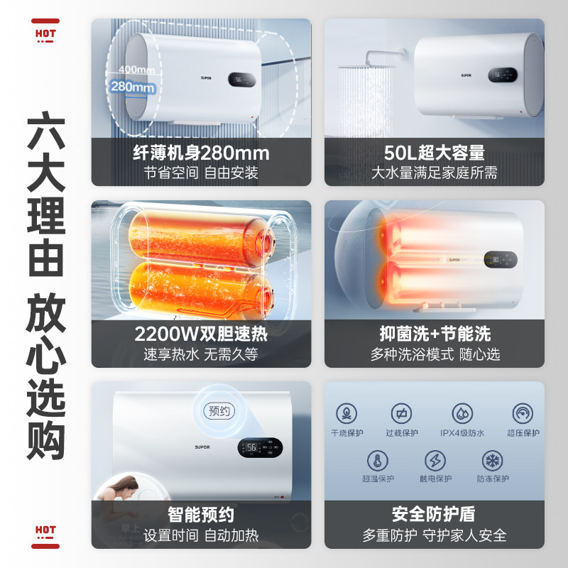焕新补贴苏泊尔DR55电热水器50L家用卫生间双胆扁桶速热储水式