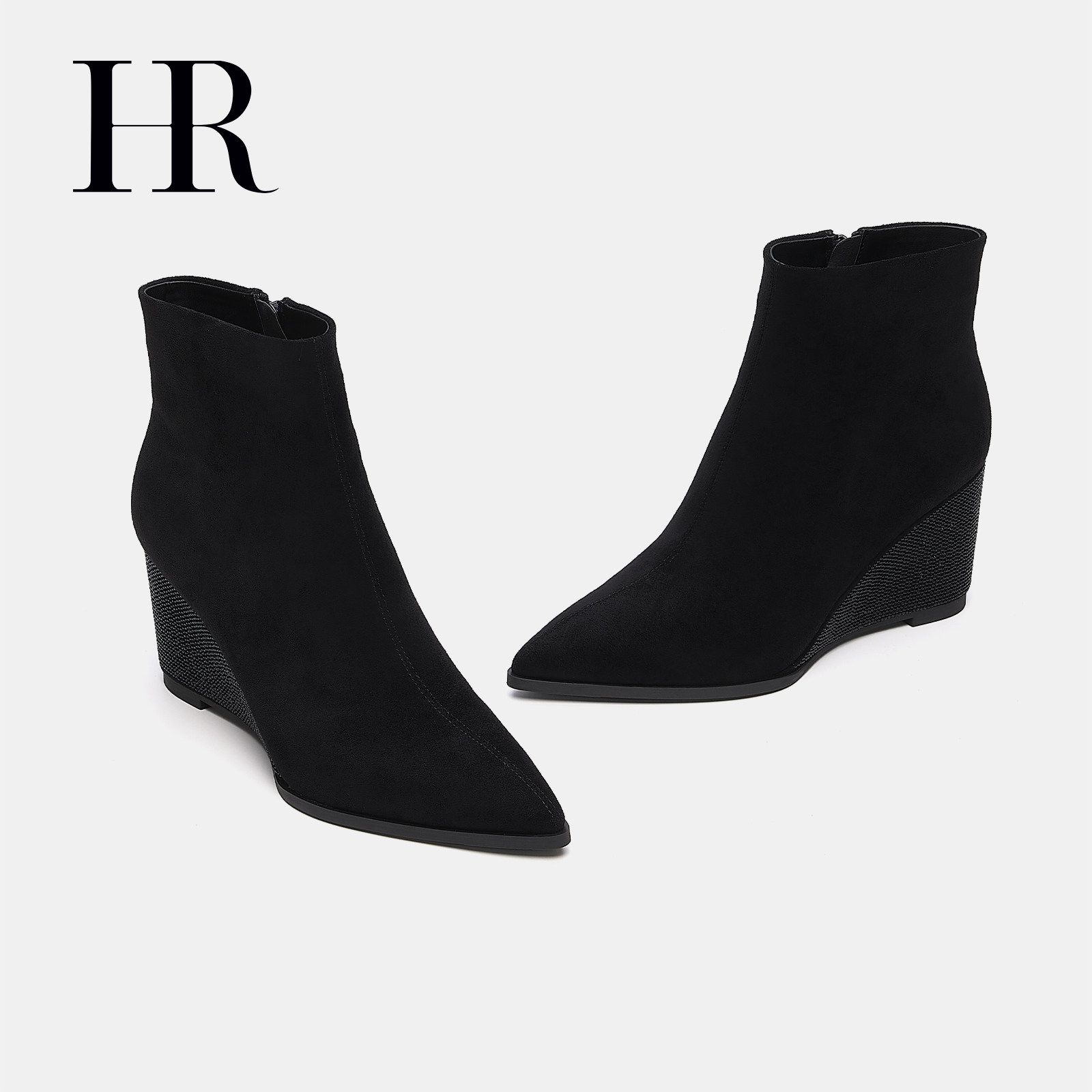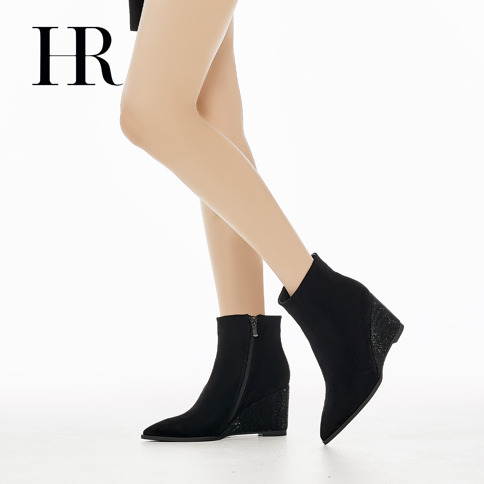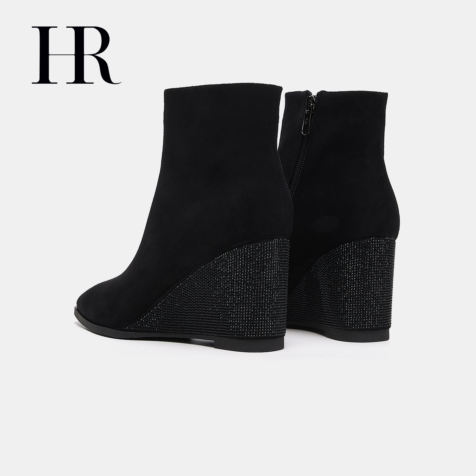 HR赫莲娜女鞋子2026冬季新款时装靴水钻坡跟加绒保暖尖头绒面短靴