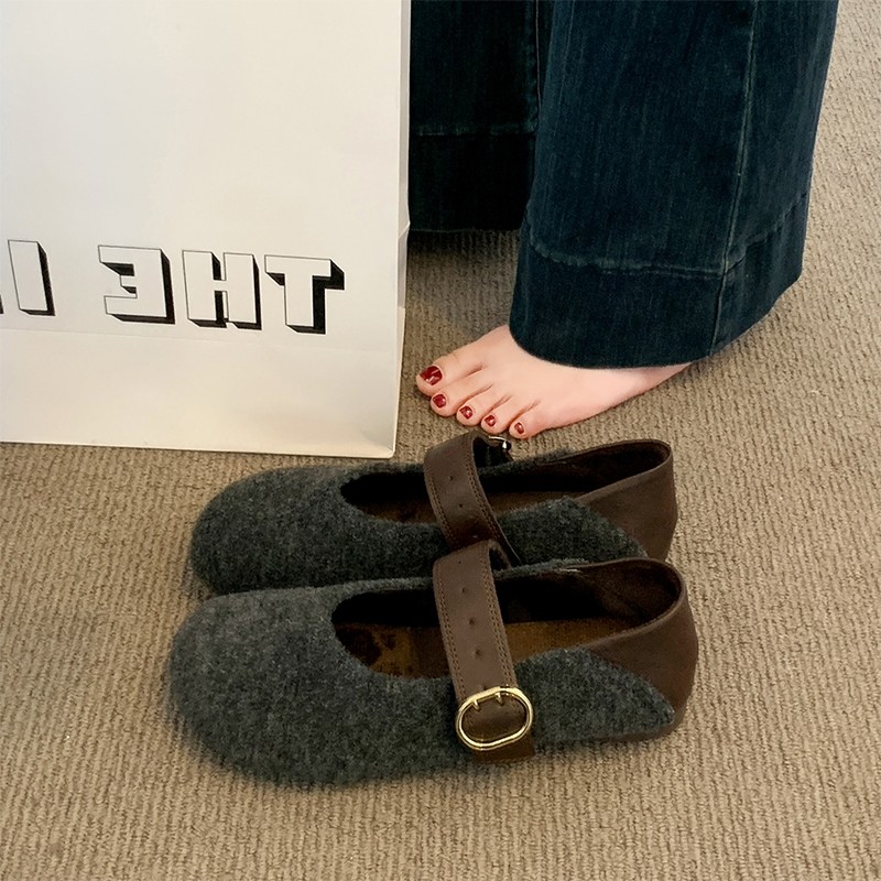 灰色加绒呢子勃肯鞋女2025秋冬新款毛毡平底豆豆鞋毛毛玛丽珍棉鞋