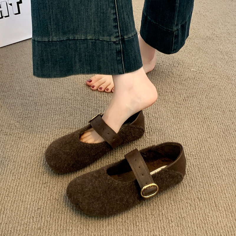 羊皮版复古玛丽珍鞋女方头秋冬季加绒保暖毛毛棉鞋平底晚晚单鞋女