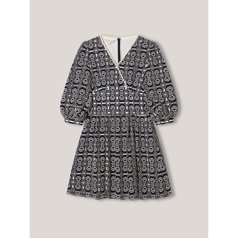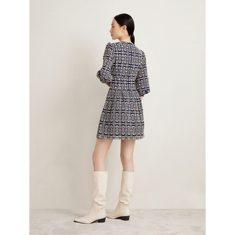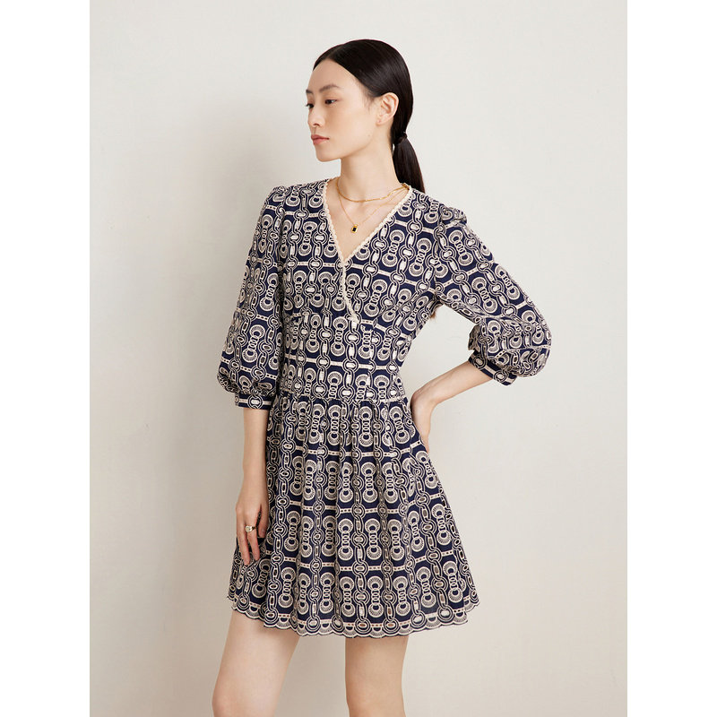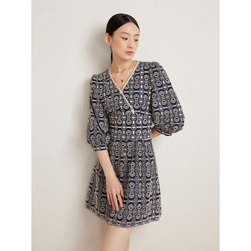Goodland美地春季法式优雅镂空刺绣V领泡泡袖连衣裙