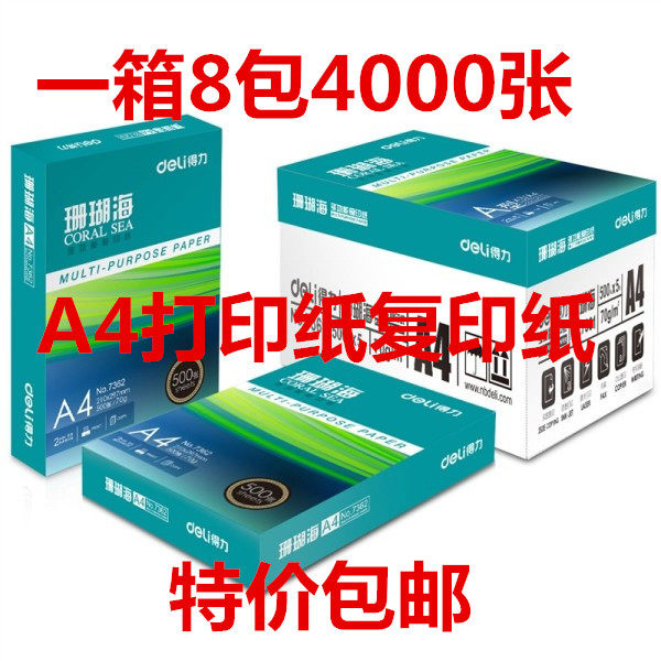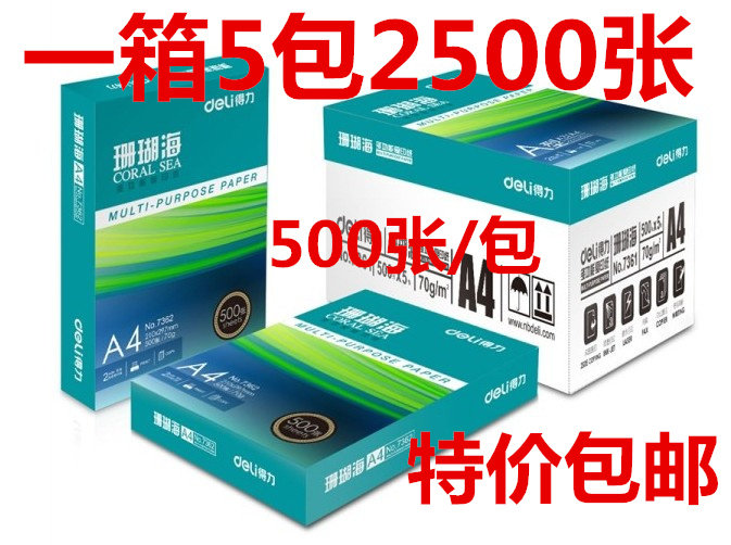得力珊瑚海复印纸 A4纸打印白纸70g80克 500张每包办公草稿纸整箱