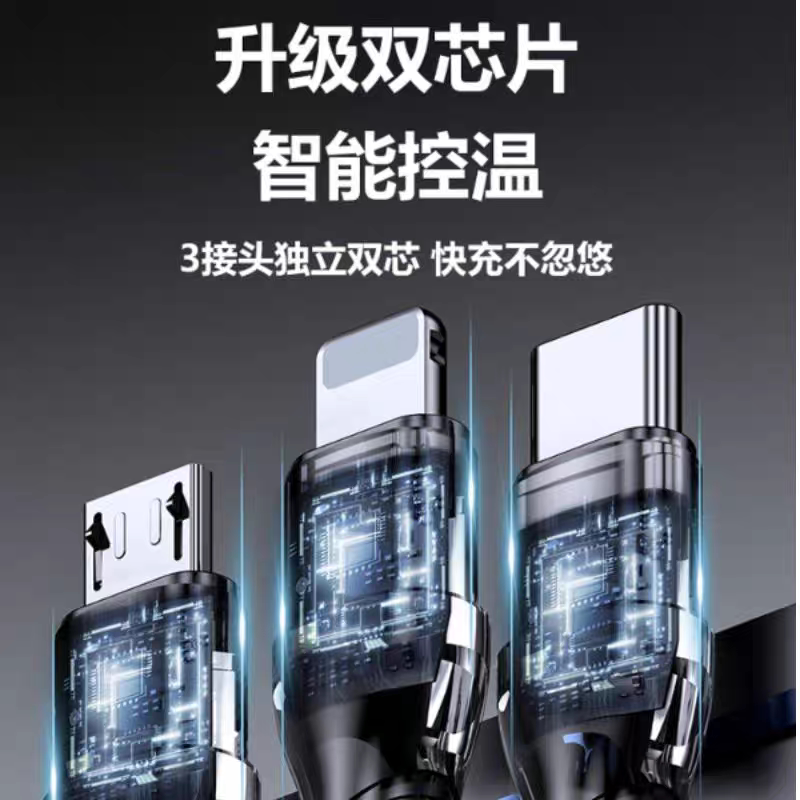 超级快充三合一数据线通用充电线适用苹果荣耀华为OPPO小米VIVO手机通用车载一拖三数据线透明芯片type-c带灯